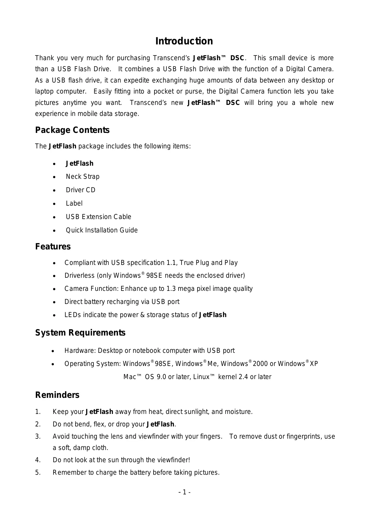 Introduction Thank you very much for purchasing Transcend's JetFlash"" DSC. This small device is more than à USB Flash Drive. It combines a USB Flash Drive with the function of a Digital Camera. As a USB flash drive, it can expedite exchanging huge amounts of data between any desktop or laptop computer. Easily fitting into a pocket or purse, the Digital Camera function lets you take pictures anytime you want. Transcend's new JetFlash" DSC will bring you a whole new experience in mobile data storage. Package Contents The J'etFlash package includes the following items: + JetFlash + Neck Strap + Driver CD + Label + USB Extension Cable + Quick Installation Guide Features + _Compliant with USB specification 1.1, True Plug and Play