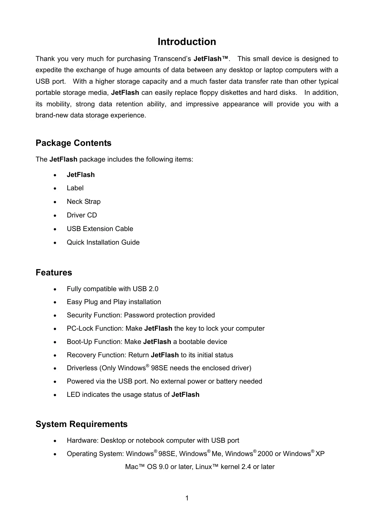 Introduction Thank you very much for purchasing Transcend's JetFlash'". This small device is designed to expedite the exchange of huge amounts of data between any desktop or laptop computers with a USB port. With a higher storage capacity and a much faster data transfer rate than other typical portable storage media, JetFlash can easily replace floppy diskettes and hard disks. In addition, its mobility, strong data retention ability, and impressive appearance will provide you with a brand-new data storage experience. Package Contents The JetFlash package includes the following items: + __JetFlash + Label + Neck Strap + Driver CD + USB Extension Cable + Quick Installation Guide Features *< Fully compatible with USB 2.0 + Easy Plug and Play installation + Security Function: Password protection provided + PC-Lock Function: Make JetFlash the key to lock your computer + Boot-Up Function: Make JetFlash a bootable device + __ Recovery Function: Return JetFlash to its initial status + __ Driverless (Only Windows® 98SE needs the enclosed driver) + __ Powered via the USB port. No external power or battery needed + LED indicates the usage status of JetFlash System Requirements + __ Hardware: Desktop or notebook computer with USB port + Operating System: Windows® 98SE, Windows® Me, Windows® 2000 or Windows® XP Mac OS 9.0 or later, Linux" kernel 2.4 or later