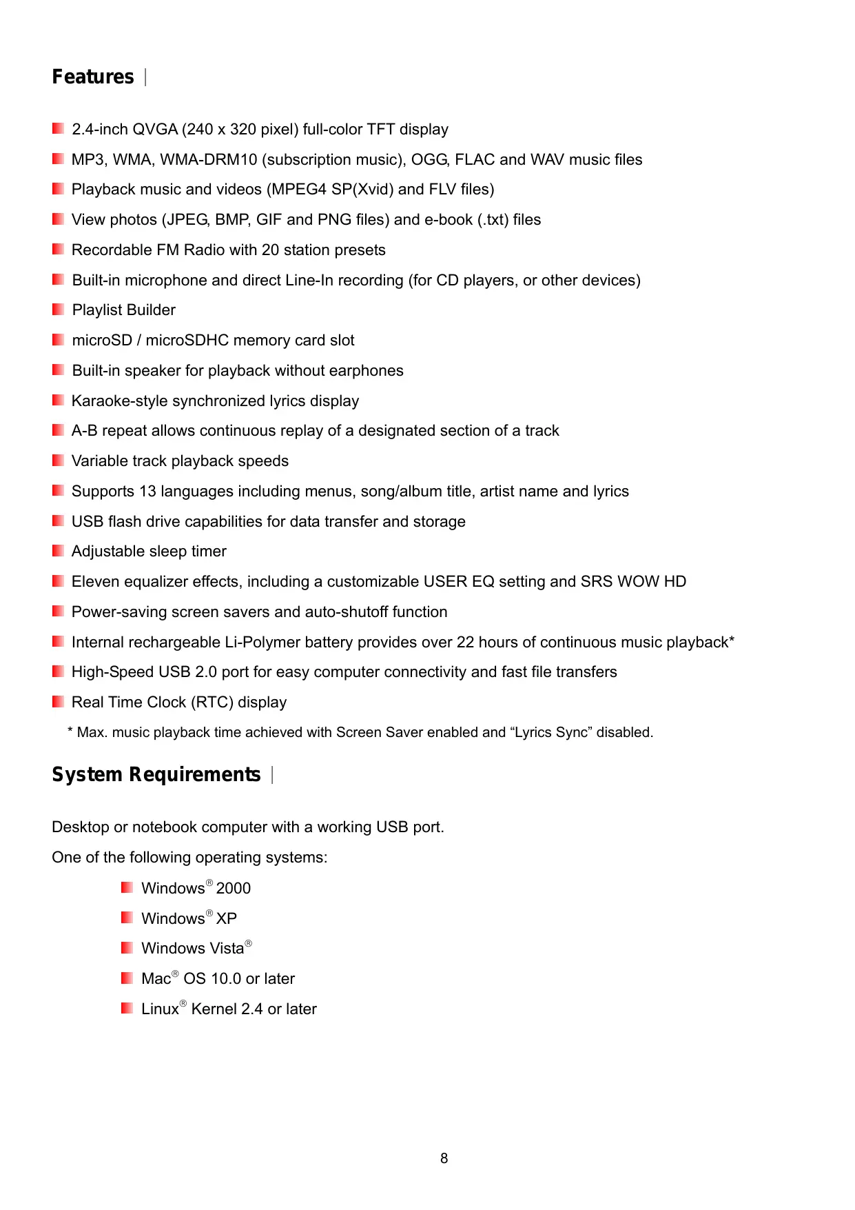 | 7. Estimated Battery Life: (fully charged battery) | 22 Hours of continuous music playback 4 Hours of continuous video playback |
