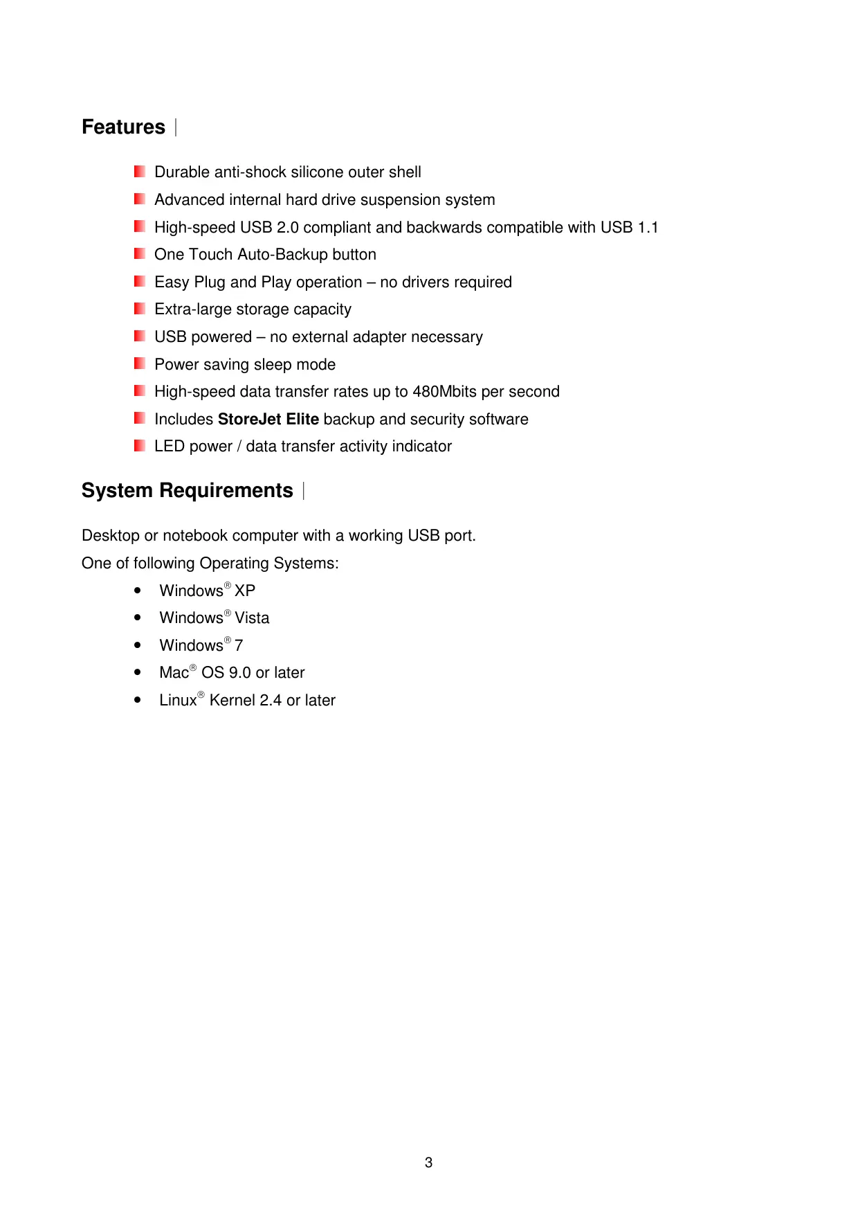 Features | Durable anti-shock silicone outer shell Advanced internal hard drive suspension system High-speed USB 2.0 compliant and backwards compatible with USB 1.1 One Touch Auto-Backup button Easy Plug and Play operation — no drivers required Extra-large storage capacity USB powered — no external adapter necessary Power saving sleep mode High-speed data transfer rates up to 480Mbits per second includes StoreJet Elite backup and security software LED power / data transfer activity indicator System Requirements | Desktop or notebook computer with a working USB port. One of following Operating Systems: + Windows® XP °__ Windows” Vista °__ Windows® 7 + Mac° OS 9.0 or later + _Linux® Kernel 2.4 or later