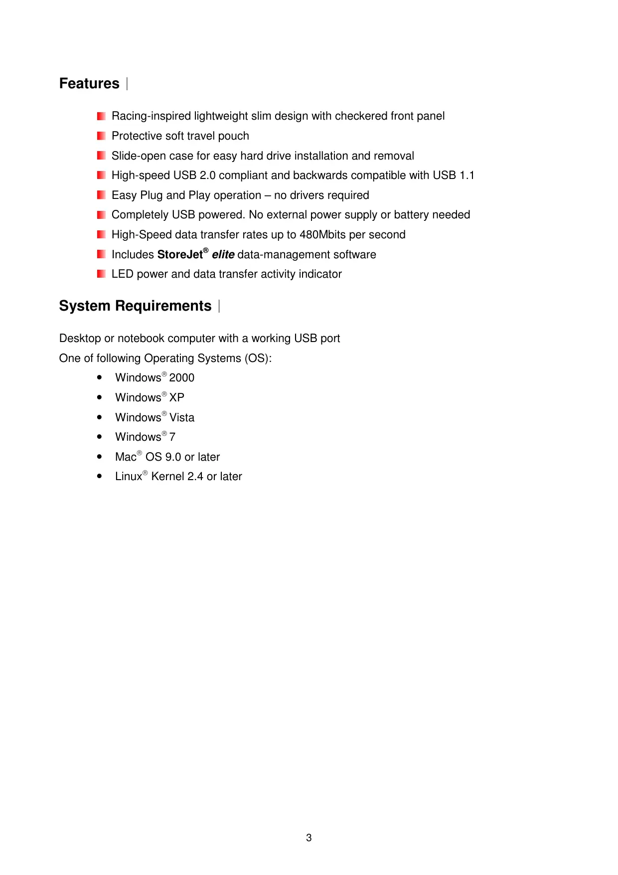 Features | Racing-inspired lightweight slim design with checkered front panel Protective soft travel pouch Slide-open case for easy hard drive installation and removal High-speed USB 2.0 compliant and backwards compatible with USB 1.1 Easy Plug and Play operation — no drivers required Completely USB powered. No external power supply or battery needed High-Speed data transfer rates up to 480Mbits per second includes StoreJet® elite data-management software LED power and data transfer activity indicator System Requirements | Desktop or notebook computer with a working USB port One of following Operating Systems (OS): Windows® 2000 Windows® XP Windows” Vista Windows® 7 Mac° OS 9.0 or later Linux® Kernel 2.4 or later