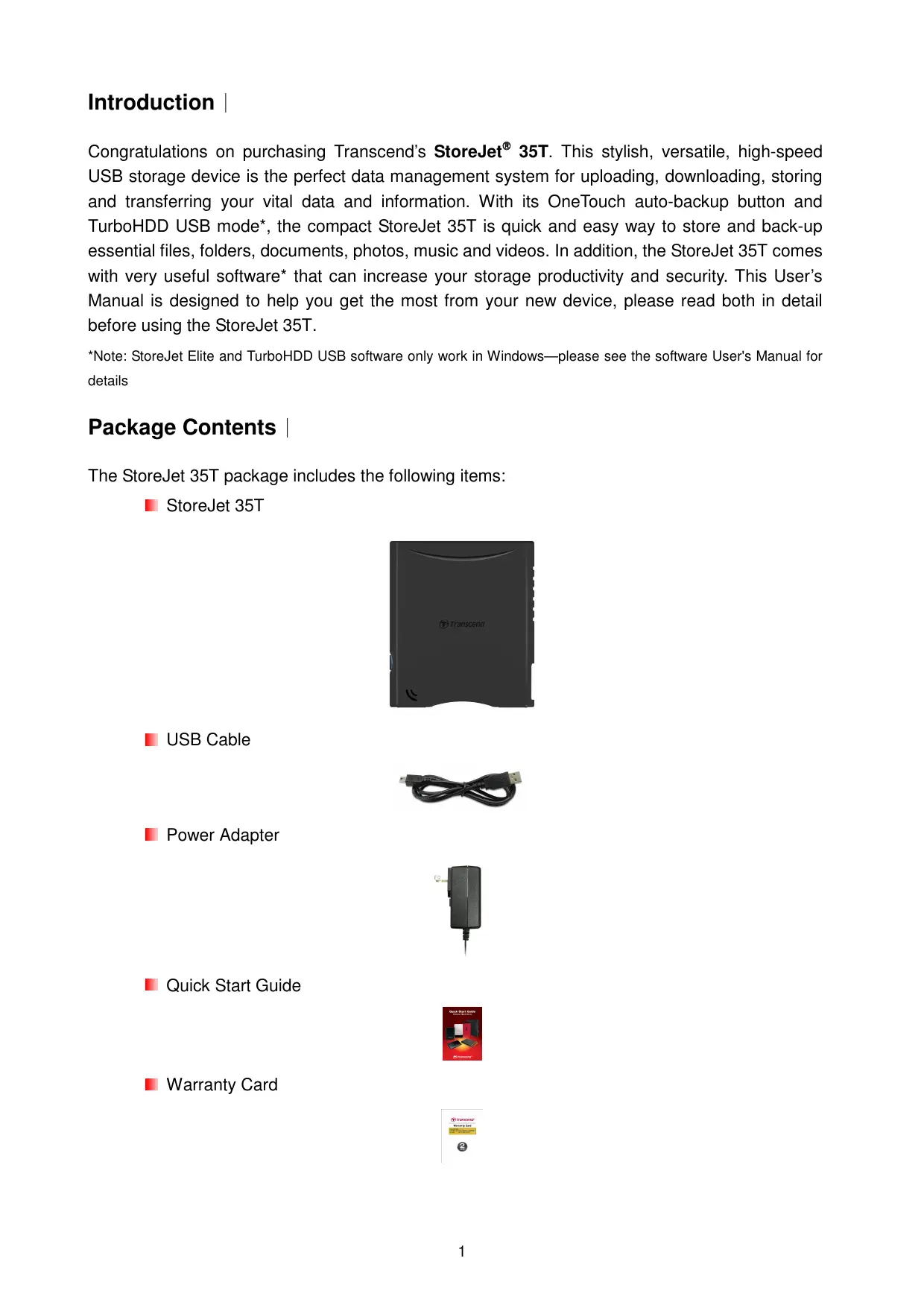 Introduction | Congratulations on purchasing Transcend's StoreJet® 35T. This stylish, versatile, high-speed USB storage device is the perfect data management system for uploading, downloading, storing and transferring your vital data and information. With its OneTouch auto-backup button and TurboHDD USB mode“, the compact StoreJet 35T is quick and easy way to store and back-up essential files, folders, documents, photos, music and videos. In addition, the StoreJet 35T comes with very useful software* that can increase your storage productivity and security. This User's Manual is designed to help you get the most from your new device, please read both in detail before using the StoreJet 35T. “Note: StoreJet Elite and TurboHDD USB software only work in Windows—please see the software User's Manual for details Package Contents | The StoreJet 35T package includes the following items: B StoreJet 35T B USB Cable B Power Adapter B Quick Start Guide B Warranty Card