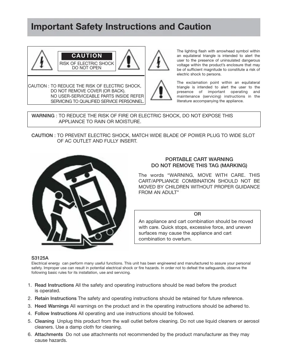 An appliance and cart combination should be moved with care. Quick stops, excessive force, and uneven surfaces may cause the appliance and cart combination to overturn. S3125A Electrical energy can perform many useful functions. This unit has been engineered and manufactured to assure your personal safety. Improper use can result in potential electrical shock or fire hazards. In order not to defeat the safeguards, observe the following basic rules for its installation, use and servicing.