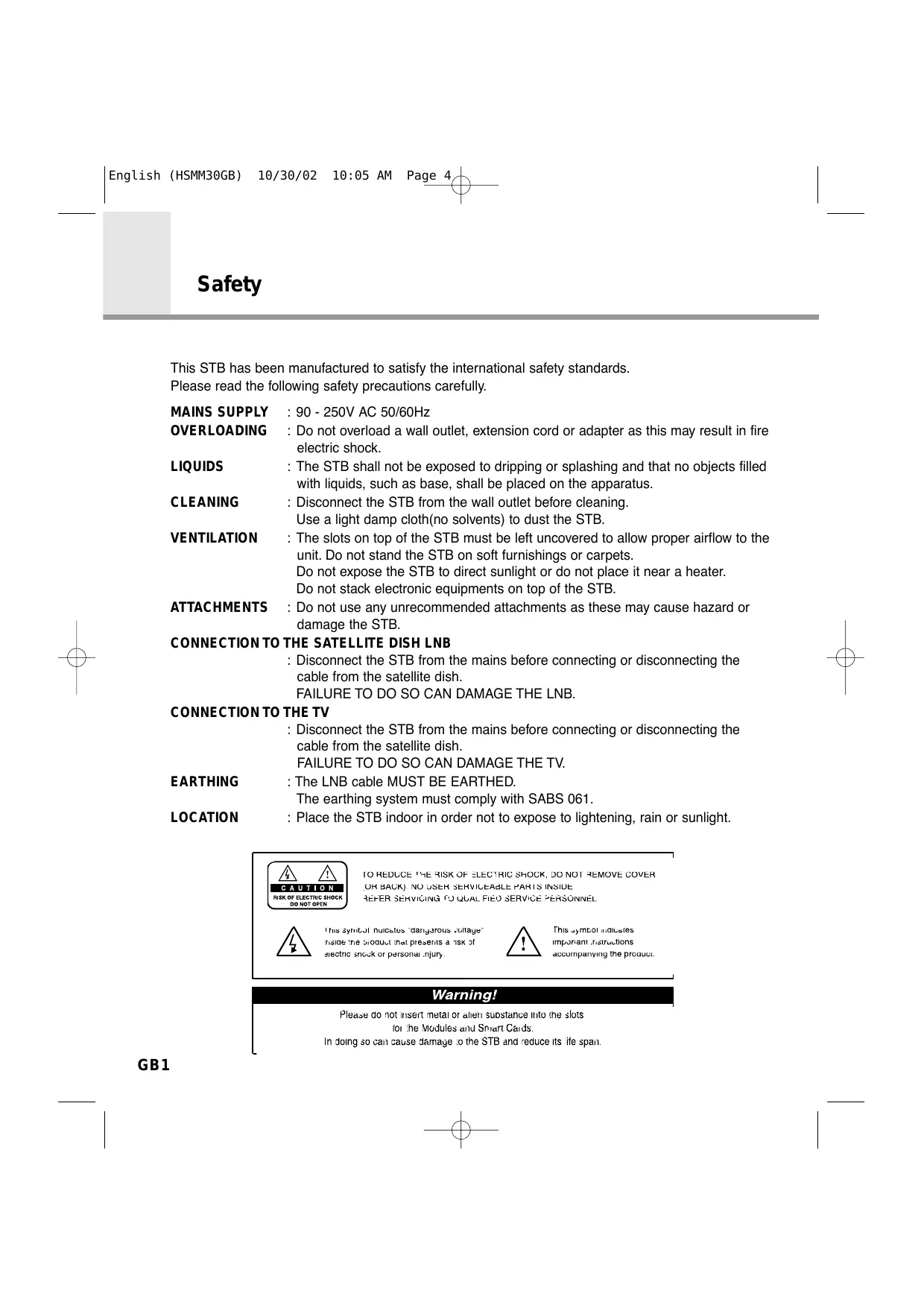 English (HSMM30GB) 10/30/02 10:05 AM Page * Safety This STB has been manufactured to satisfy the international safety standards. Please read the following safety precautions carefully. MAINS SUPPLY : 90 - 250V AC 50/60Hz OVERLOADING : Do not overload a wall outlet, extension cord or adapter as this may result in fire electric shock. LIQUIDS : The STB shall not be exposed to dripping or splashing and that no objects filled with liquids, such as base, shall be placed on the apparatus. CLEANING : Disconnect the STB from the wall outlet before cleaning. Use a light damp cloth(no solvents) to dust the STB. VENTILATION : The slots on top of the STB must be left uncovered to allow proper airflow to the unit. Do not stand the STB on soft furnishings or carpets. Do not expose the STB to direct sunlight or do not place it near a heater. Do not stack electronic equipments on top of the STB. ATTACHMENTS : Do not use any unrecommended attachments as these may cause hazard or damage the STB.