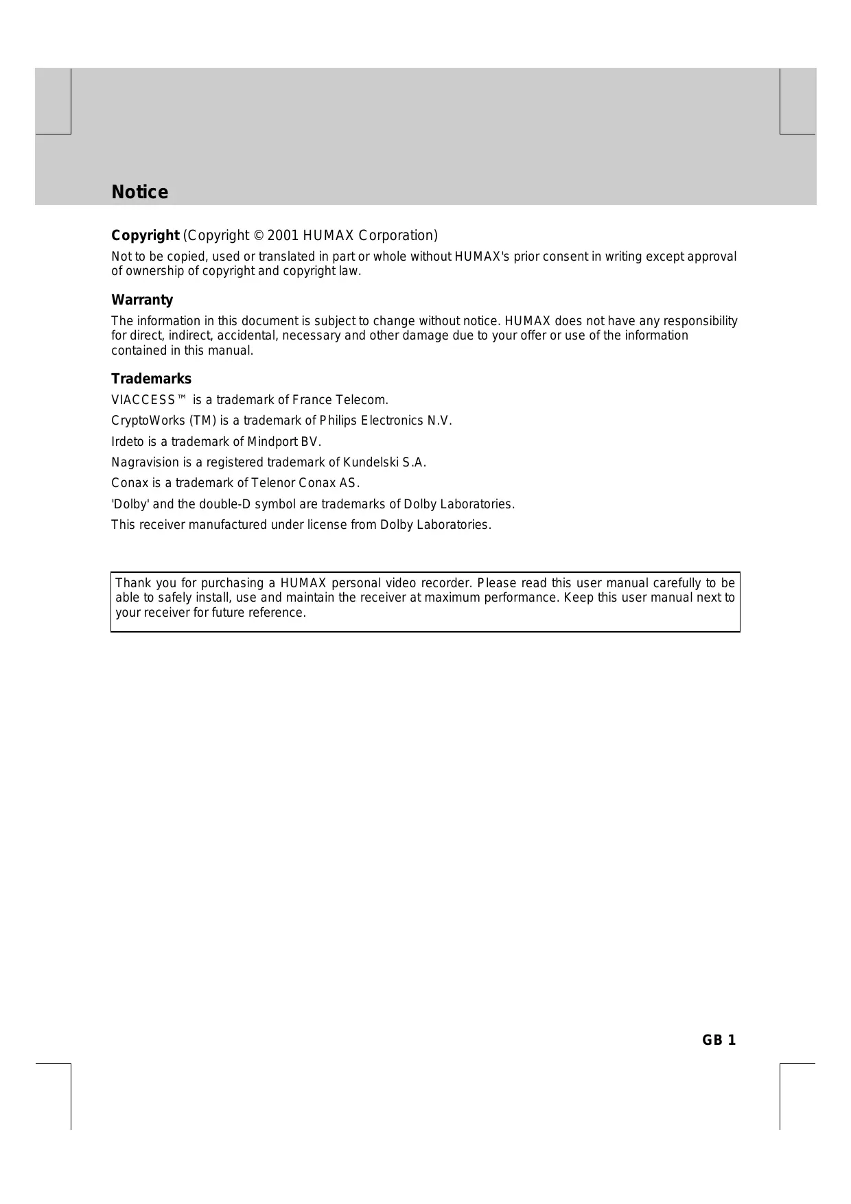 Thank you for purchasing a HUMAX personal video recorder. Please read this user manual carefully to be able to safely install, use and maintain the receiver at maximum performance. Keep this user manual next to your receiver for future reference.