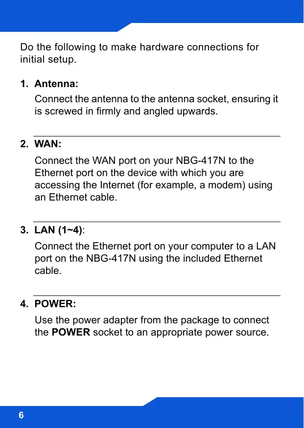 1. Antenna: Connect the antenna to the antenna socket, ensuring it is screwed in firmly and angled upwards. 2. WAN: Connect the WAN port on your NBG-417N to the Ethernet port on the device with which you are accessing the Internet (for example, a modem) using an Ethernet cable. 3. LAN (1~4): Connect the Ethernet port on your computer to a LAN port on the NBG-417N using the included Ethernet cable. 4. POWER: Use the power adapter from the package to connect the POWER socket to an appropriate power source.