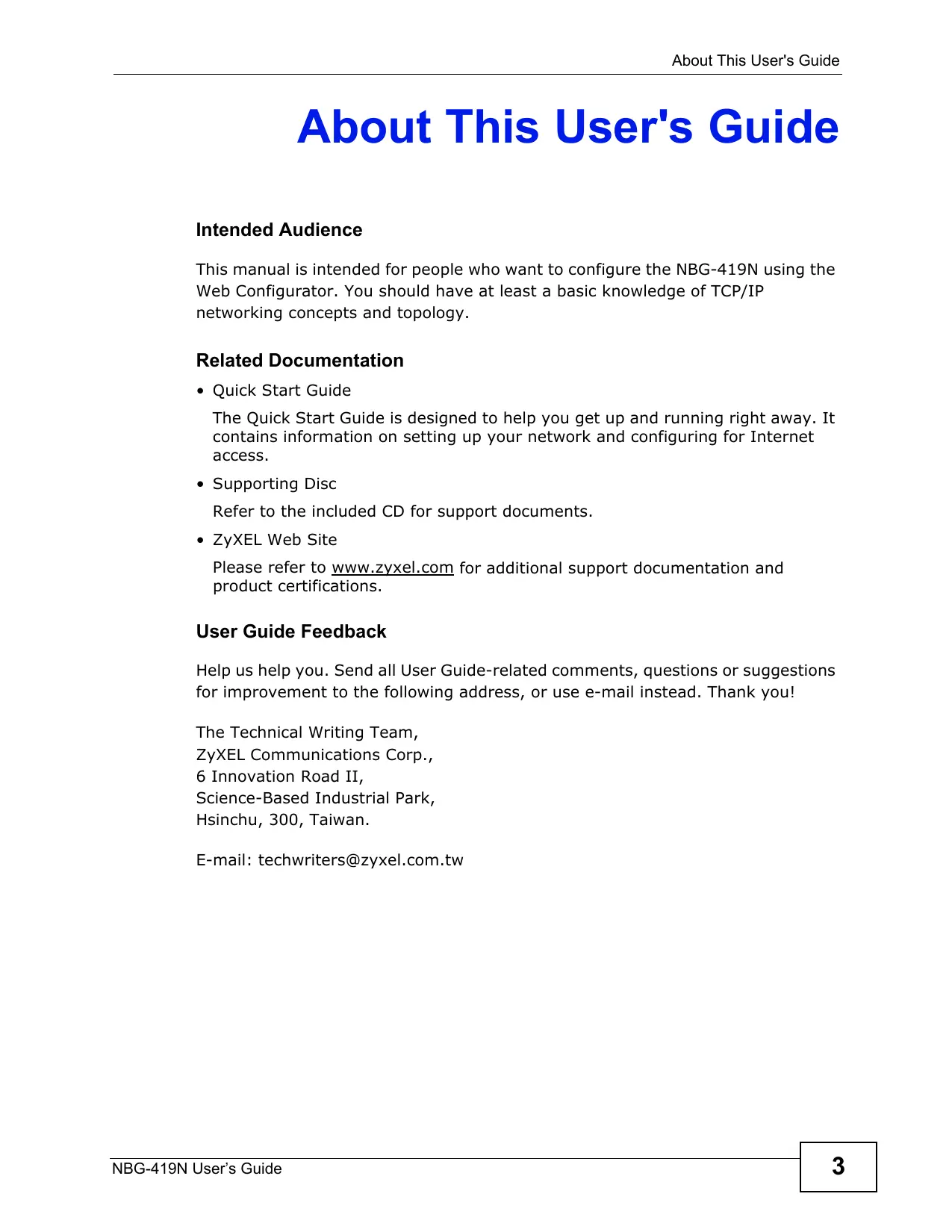 This manual is intended for people who want to configure the NBG-419N using the Web Configurator. You should have at least a basic knowledge of TCP/IP networking concepts and topology.
