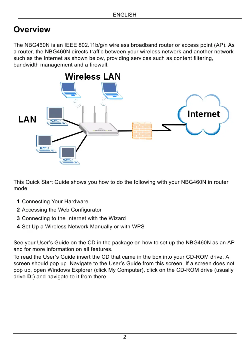 1 Connecting Your Hardware 2 Accessing the Web Configurator 3 Connecting to the Internet with the Wizard 4 Set Up a Wireless Network Manually or with WPS See your User’s Guide on the CD in the package on how to set up the NBG460N as an AP and for more information on all features. To read the User’s Guide insert the CD that came in the box into your CD-ROM drive. A screen should pop up. Navigate to the User’s Guide from this screen. If a screen does not pop up, open Windows Explorer (click My Computer), click on the CD-ROM drive (usually drive D:) and navigate to it from there.