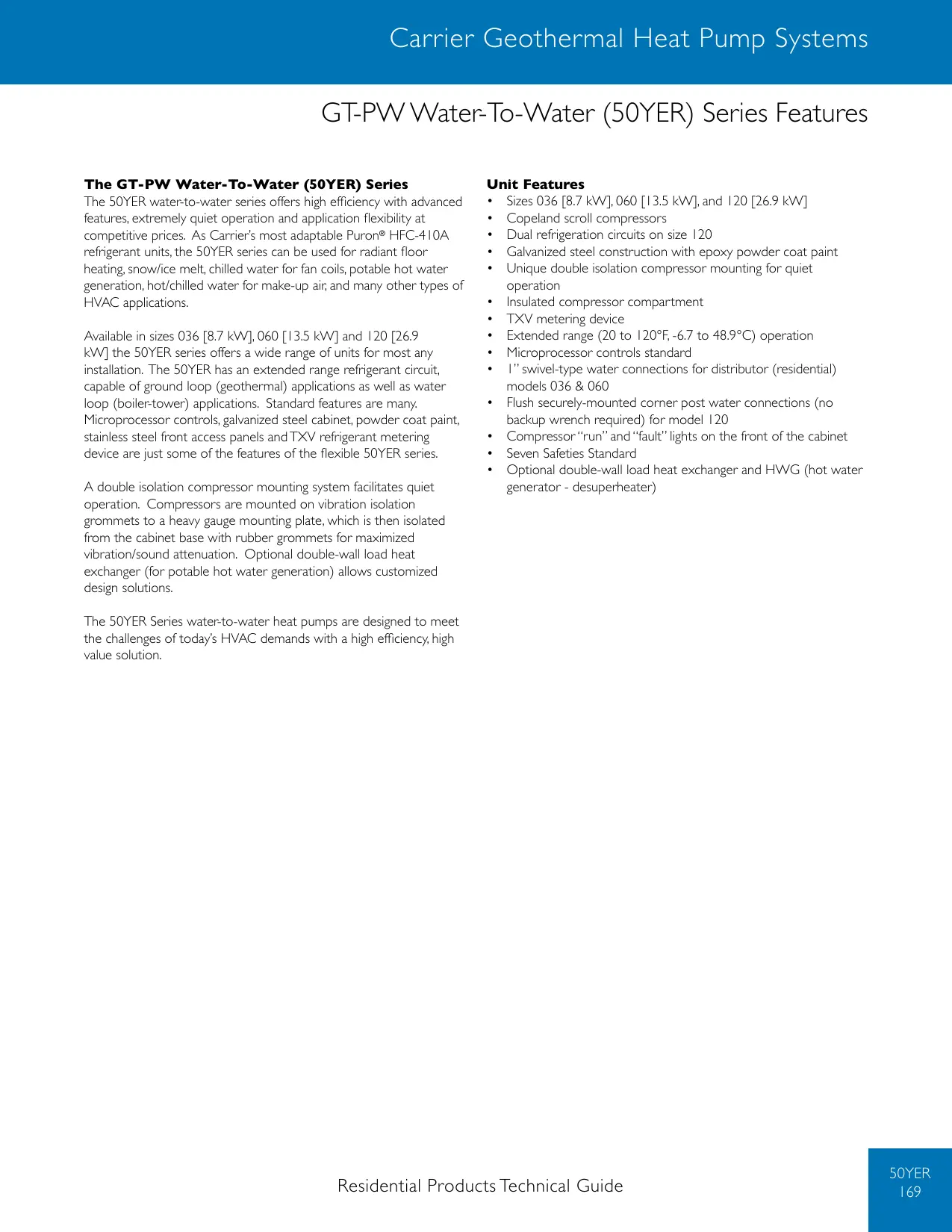 - Revision History Carrier : Turn to the Exper ts. Carrier Geothermal Heat Pump Systems GT-PW Water-To-Water (50YER) Series Features The GT-PW Water-To-Water (50YER) Series The 50YER water-to-water series offers high efficiency with advanced features, extremely quiet operation and application flexibility at competitive prices. As Carrier’s most adaptable Puron® HFC-410A refrigerant units, the 50YER series can be used for radiant floor heating, snow/ice melt, chilled water for fan coils, potable hot water generation, hot/chilled water for make-up air, and many other types of HVAC applications. Available in sizes 036 [8.7 kW], 060 [13.5 kW] and 120 [26.9 kW] the 50YER series offers a wide range of units for most any installation. The 50YER has an extended range refrigerant circuit, capable of ground loop (geothermal) applications as well as water loop (boiler-tower) applications. Standard features are many. Microprocessor controls, galvanized steel cabinet, powder coat paint, stainless steel front access panels and TXV refrigerant metering device are just some of the features of the flexible 50YER series. A double isolation compressor mounting system facilitates quiet operation. Compressors are mounted on vibration isolation grommets to a heavy gauge mounting plate, which is then isolated from the cabinet base with rubber grommets for maximized vibration/sound attenuation. Optional double-wall load heat exchanger (for potable hot water generation) allows customized design solutions. Unit Features p. 194