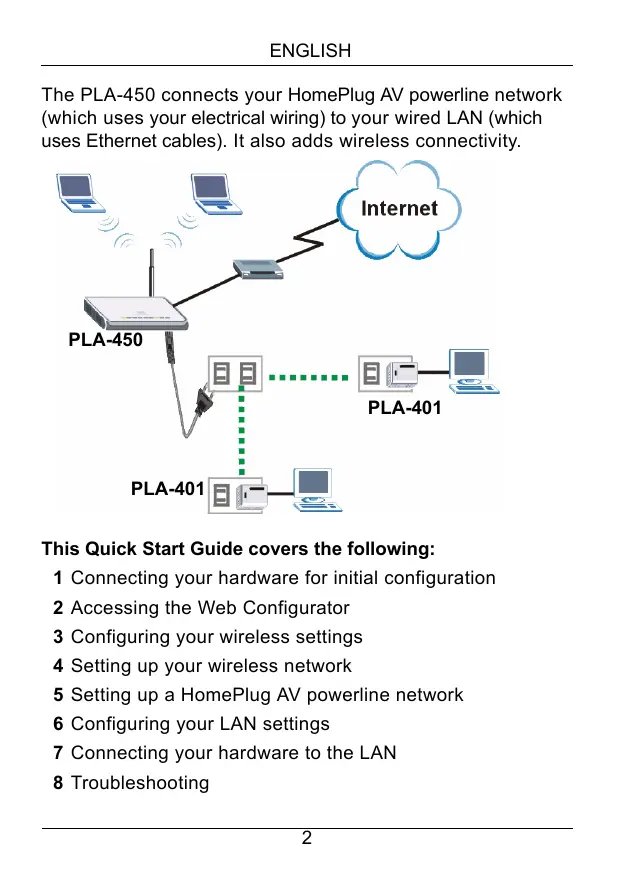 ENGLISH The PLA-450 connects your HomePlug AV powerline network (which uses your electrical wiring) to your wired LAN (which uses Ethernet cables). It also adds wireless connectivity.