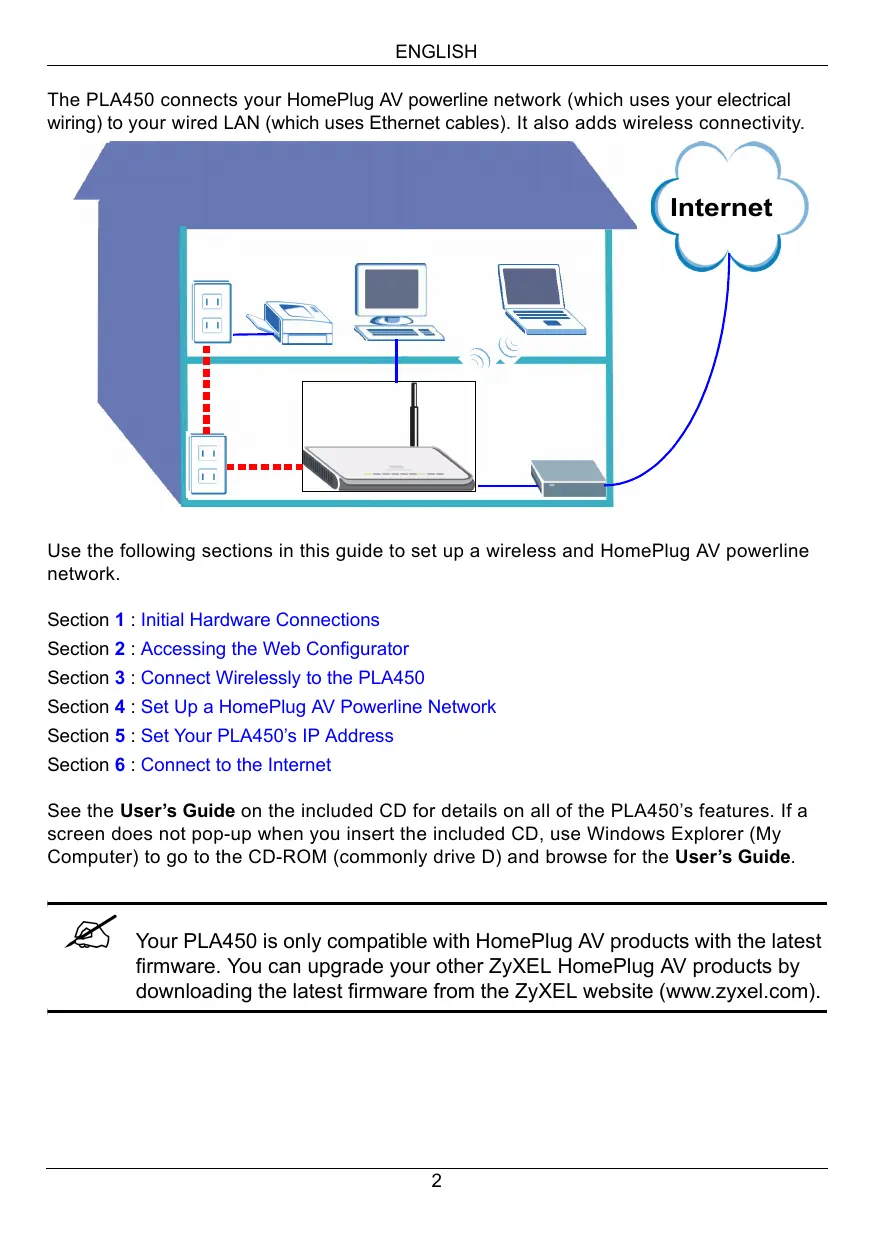 Æ Your PLA450 is only compatible with HomePlug AV products with the latest fimware. You can upgrade your other ZyXEL HomePlug AV products by downloading the latest fimware from the ZyXEL website (www.zyxel.com).