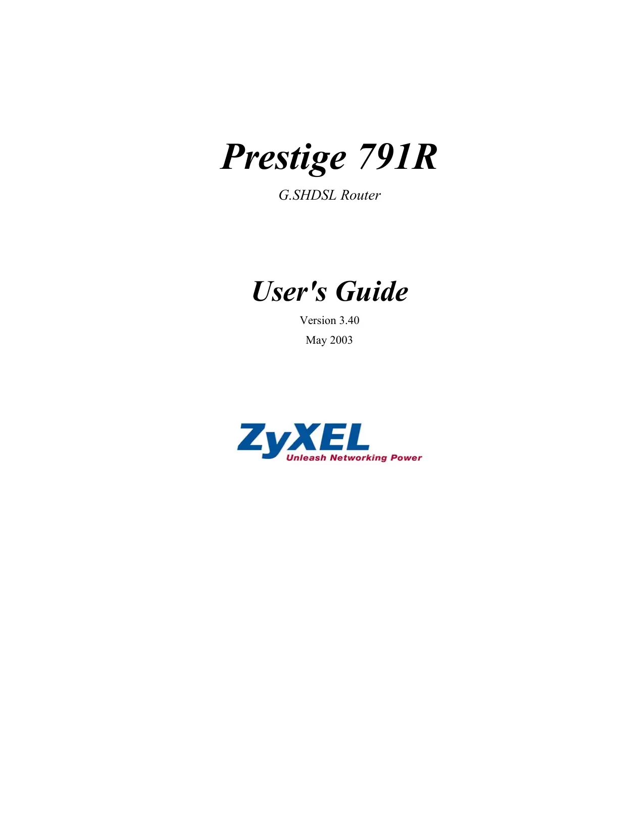 Prestige 791R G.SHDSL Router Copyright Copyright © 2003 by ZyXEL Communications Corporation. The contents of this publication may not be reproduced in any part or as a whole, transcribed, stored in a retrieval system, translated into any language, or transmitted in any form or by any means, electronic, mechanical, magnetic, optical, chemical, photocopying, manual, or otherwise, without the prior written permission of ZyXEL Communications Corporation. Published by ZyXEL Communications Corporation. All rights reserved. Disclaimer ZyXEL does not assume any liability arising out of the application or use of any products, or software described herein. Neither does it convey any license under its patent rights nor the patent rights of others. ZyXEL further reserves the right to make changes in any products described herein without notice. This publication is subject to change without notice. Trademarks ZyNOS (ZyXEL Network Operating System) is a registered trademark of ZyXEL Communications, Inc. Other trademarks mentioned in this publication are used for identification purposes only and may be properties of their respective owners. ïl Copyright
