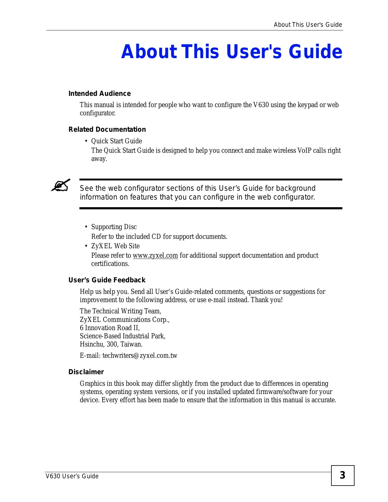 - ZyXEL Web Site Please refer to www.zyxel.com for additional support documentation and product certifications. User’s Guide Feedback Help us help you. Send all User’s Guide-related comments, questions or suggestions for improvement to the following address, or use e-mail instead. Thank you! The Technical Writing Team, ZyXEL Communications Corp. 6 Innovation Road II, Science-Based Industrial Park, Hsinchu, 300, Taiwan. E-mail: techwriters@ zyxel.com.tw Disclaimer Graphics in this book may differ slightly from the product due to differences in operating systems, operating system versions, or if you installed updated firmware/software for your device. Every effort has been made to ensure that the information in this manual is accurate. V630 Users Guide 3