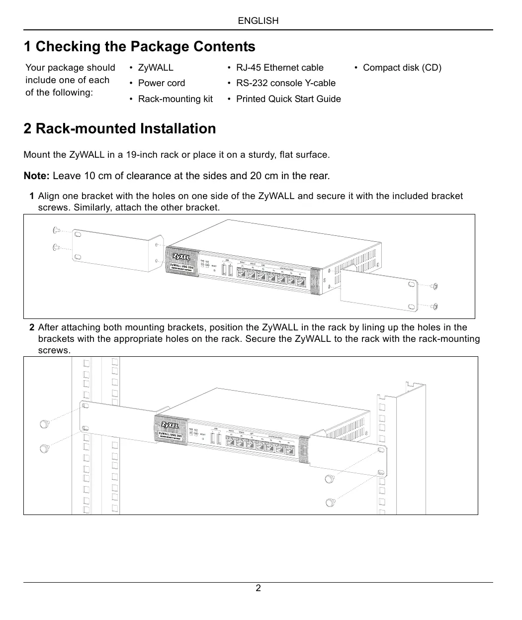 - Compact disk (CD) 2 Rack-mounted Installation Mount the ZyWALL in a 19-inch rack or place it on a sturdy, flat surface. Note: Leave 10 cm of clearance at the sides and 20 cm in the rear. 1 Align one bracket with the holes on one side of the ZyWALL and secure it with the included bracket screws. Similarly, attach the other bracket. 2 After attaching both mounting brackets, position the ZyWALL in the rack by lining up the holes in the brackets with the appropriate holes on the rack. Secure the ZyWALL to the rack with the rack-mounting screws.