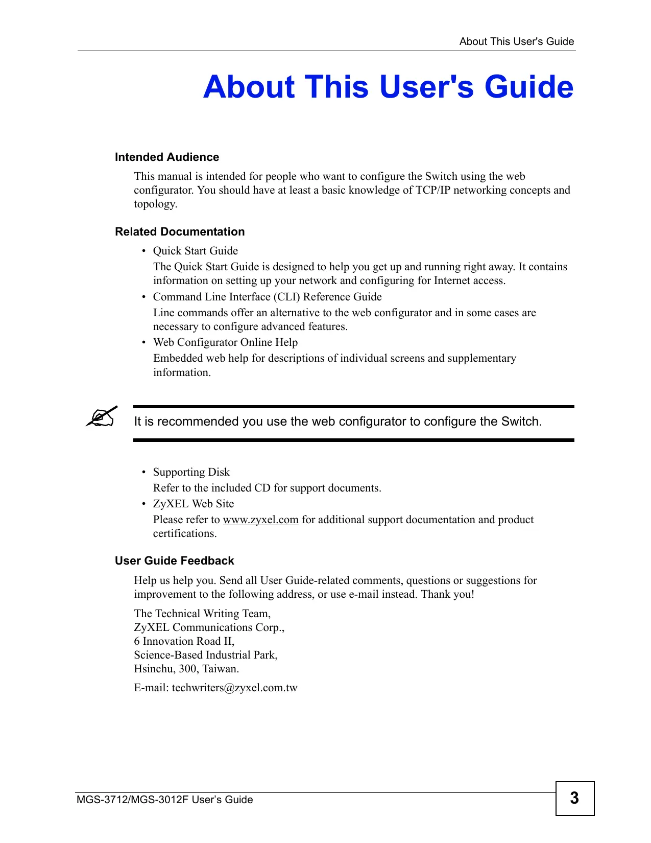 The MGS-3712 and MGS-3712F models may be referred to as the “Switch”, the “device”, the “system” or the “product” in this User’s Guide.