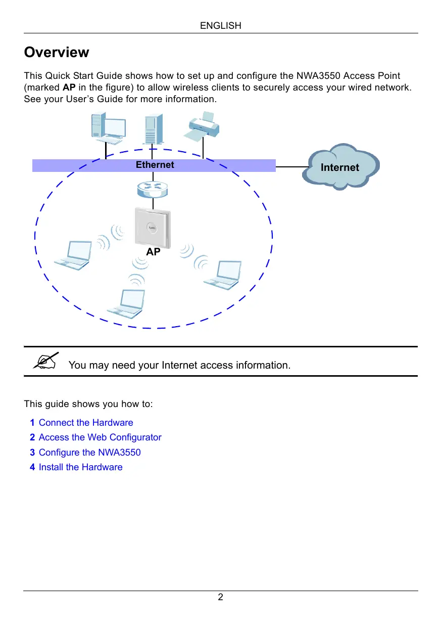 1 Connect the Hardware 2 Access the Web Configurator 3 Configure the NWA3550 4 Install the Hardware