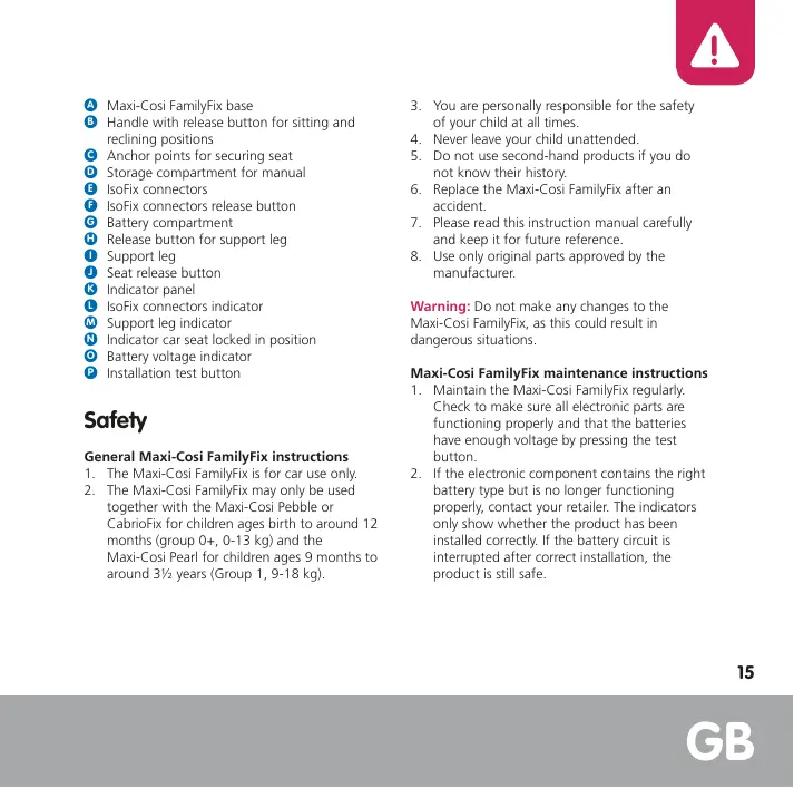 4. Never leave your child unattended. 5. Do not use second-hand products if you do not know their history. 6. Replace the Maxi-Cosi FamilyFix after an accident. 7. Please read this instruction manual carefully and keep it for future reference. 8. Use only original parts approved by the manufacturer. Warning: Do not make any changes to the Maxi-Cosi FamilyFix, as this could result in dangerous situations. Maxi-Cosi FamilyFix maintenance instructions 1. Maintain the Maxi-Cosi FamilyFix regularly. Check to make sure all electronic parts are functioning properly and that the batteries have enough voltage by pressing the test button. 2. If the electronic component contains the right battery type but is no longer functioning properly, contact your retailer. The indicators only show whether the product has been installed correctly. If the battery circuit is interrupted after correct installation, the product is still safe.
