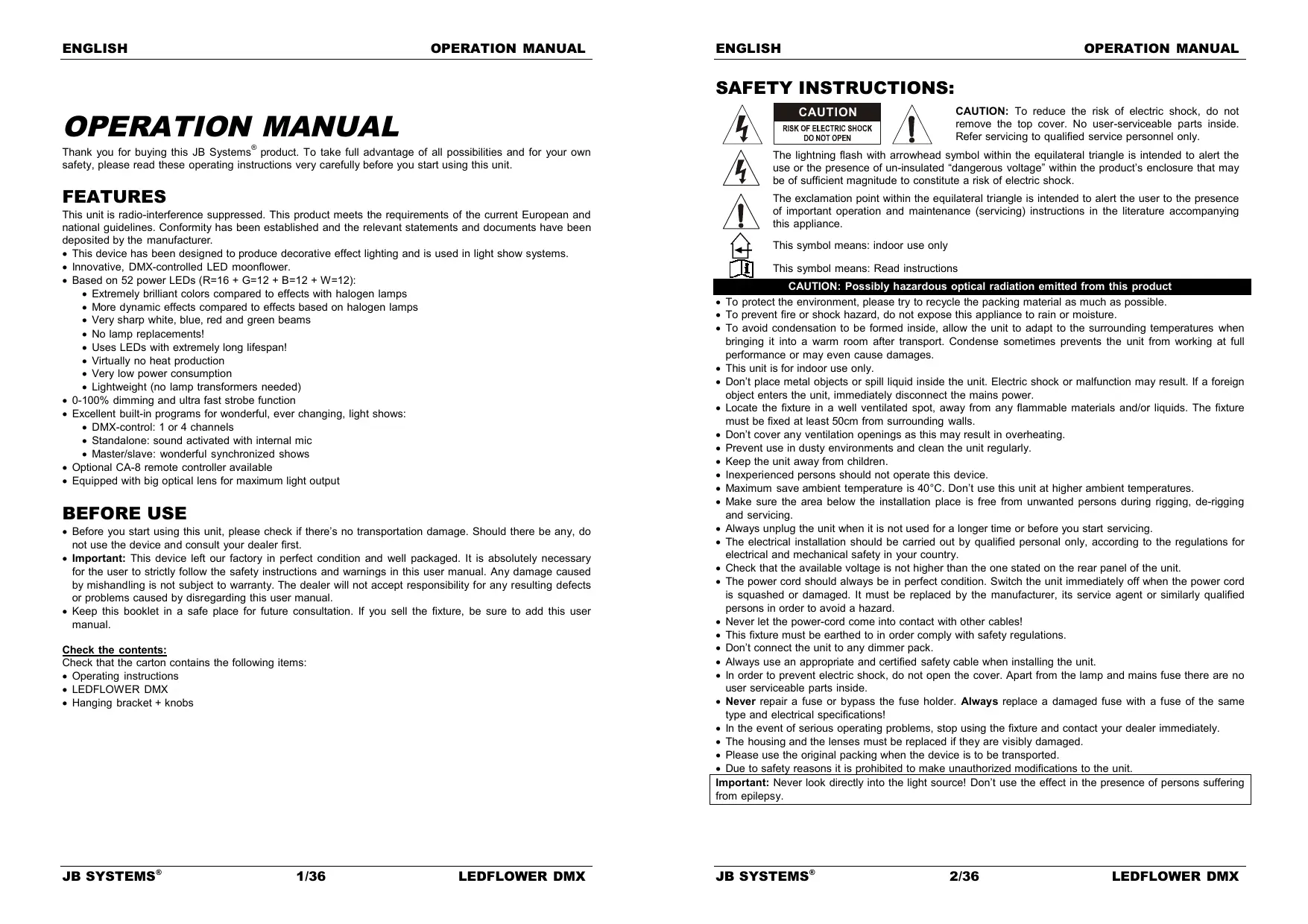 Thank you for buying this JB Systems product. To take full advantage of all possibilities and for your own safety, please read these operating instructions very carefully before you start using this unit. FEATURES This unit is radio-interference suppressed. This product meets the requirements of the current European and national guidelines. Conformity has been established and the relevant statements and documents have been deposited by the manufacturer. This device has been designed to produce decorative effect lighting and is used in light show systems. Innovative, DMX-controlled LED moonflower. Based on 52 power LEDs (R=16 + G=12 + B=12 + W=12): Extremely brilliant colors compared to effects with halogen lamps More dynamic effects compared to effects based on halogen lamps Very sharp white, blue, red and green beams No lamp replacements! Uses LEDs with extremely long lifespan! Virtually no heat production Very low power consumption Lightweight (no lamp transformers needed) 0-100% dimming and ultra fast strobe function Excellent built-in programs for wonderful, ever changing, light shows: DMX-control: 1 or 4 channels Standalone: sound activated with internal mic Master/slave: wonderful synchronized shows Optional CA-8 remote controller available Equipped with big optical lens for maximum light output BEFORE USE Before you start using this unit, please check if there’s no transportation damage. Should there be any, do not use the device and consult your dealer first. Important: This device left our factory in perfect condition and well packaged. It is absolutely necessary for the user to strictly follow the safety instructions and warnings in this user manual. Any damage caused by mishandling is not subject to warranty. The dealer will not accept responsibility for any resulting defects or problems caused by disregarding this user manual. Keep this booklet in a safe place for future consultation. If you sell the fixture, be sure to add this user manual. Check the contents: Check that the carton contains the following items: Operating instructions LEDFLOWER DMX Hanging bracket + knobs JB SYSTEMS® 1/36 LEDFLOWER DMX CAUTION: To reduce the risk of electric shock, do not remove the top cover. No user-serviceable parts inside. Refer servicing to qualified service personnel only. The lightning flash with arrowhead symbol within the equilateral triangle is intended to alert the use or the presence of un-insulated “dangerous voltage” within the product’s enclosure that may be of sufficient magnitude to constitute a risk of electric shock. The exclamation point within the equilateral triangle is intended to alert the user to the presence of important operation and maintenance (servicing) instructions in the literature accompanying this appliance. This symbol means: indoor use only This symbol means: Read instructions CAUTION: Possibly hazardous optical radiation emitted from this product To protect the environment, please try to recycle the packing material as much as possible. To prevent fire or shock hazard, do not expose this appliance to rain or moisture. To avoid condensation to be formed inside, allow the unit to adapt to the surrounding temperatures when bringing it into a warm room after transport. Condense sometimes prevents the unit from working at full performance or may even cause damages. This unit is for indoor use only. Don’t place metal objects or spill liquid inside the unit. Electric shock or malfunction may result. If a foreign object enters the unit, immediately disconnect the mains power. Locate the fixture in a well ventilated spot, away from any flammable materials and/or liquids. The fixture must be fixed at least 50cm from surrounding walls. Don’t cover any ventilation openings as this may result in overheating. Prevent use in dusty environments and clean the unit regularly. Keep the unit away from children. Inexperienced persons should not operate this device. Maximum save ambient temperature is 40°C. Don’t use this unit at higher ambient temperatures. Make sure the area below the installation place is free from unwanted persons during rigging, de-rigging and servicing. Always unplug the unit when it is not used for a longer time or before you start servicing. The electrical installation should be carried out by qualified personal only, according to the regulations for electrical and mechanical safety in your country. Check that the available voltage is not higher than the one stated on the rear panel of the unit. The power cord should always be in perfect condition. Switch the unit immediately off when the power cord is squashed or damaged. It must be replaced by the manufacturer, its service agent or similarly qualified persons in order to avoid a hazard. Never let the power-cord come into contact with other cables! This fixture must be earthed to in order comply with safety regulations. Don’t connect the unit to any dimmer pack. Always use an appropriate and certified safety cable when installing the unit. In order to prevent electric shock, do not open the cover. Apart from the lamp and mains fuse there are no user serviceable parts inside. Never repair a fuse or bypass the fuse holder. Always replace a damaged fuse with a fuse of the same type and electrical specifications! In the event of serious operating problems, stop using the fixture and contact your dealer immediately. The housing and the lenses must be replaced if they are visibly damaged. Please use the original packing when the device is to be transported. Due to safety reasons it is prohibited to make unauthorized modifications to the unit. Important: Never look directly into the light source! Don’t use the effect in the presence of persons suffering from epilepsy. JB SYSTEMS® 2/36 LEDFLOWER DMX ENGLISH OPERATION MANUAL DESCRIPTION: How to set the DIP-switches to obtain the right starting address: Each of the first 9 DIP-switches correspond to a certain DMX-value: DIP