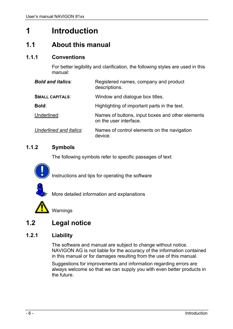 The software and manual are subject to change without notice. NAVIGON AG is not liable for the accuracy of the information contained in this manual or for damages resulting from the use of this manual. Suggestions for improvements and information regarding errors are always welcome so that we can supply you with even better products in the future. -6- Introduction