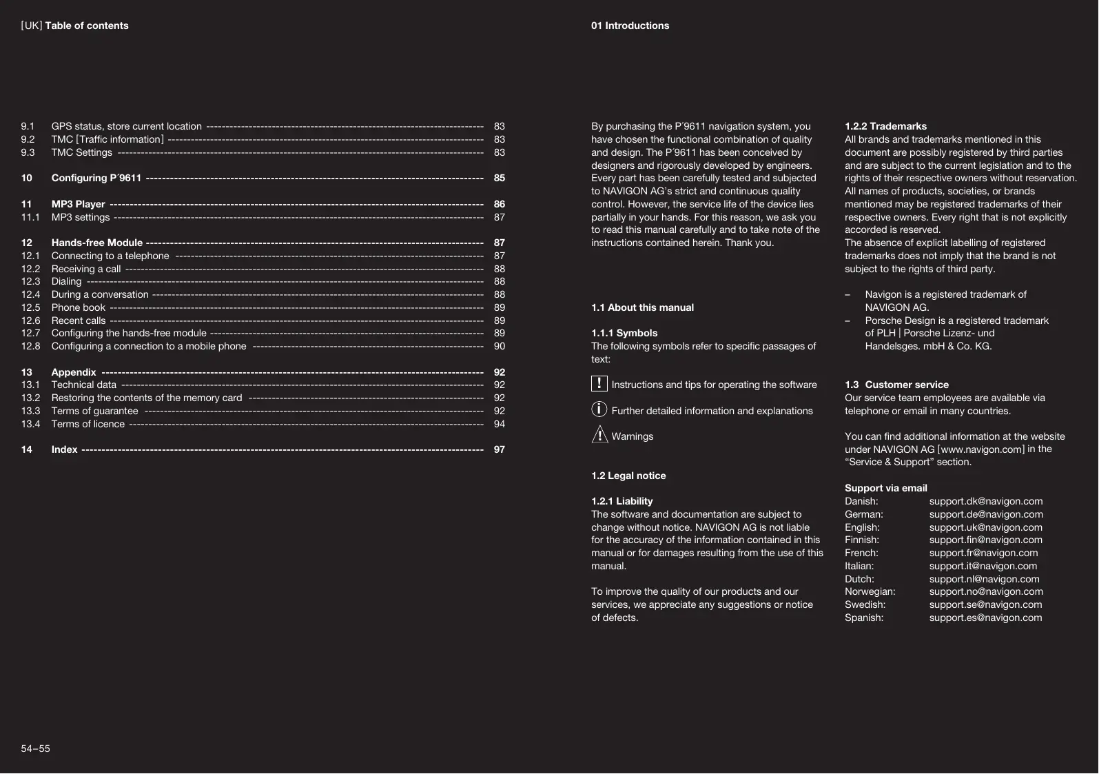 [UK] Table of contents 54-55 GPS status, store current location 83 TMC [Traffic information] - 83 TMC Settings — 83 Configuring P'9611 —- 85 MP3 Player MP3 settings -- Hands-free Module -- Connecting to a telephone - Recelving a call Dialing During a conversation Phone book Recent calls Configuring the hands-free module Configuring a connection to a mobile phone -- Appendix Technical data 92 Restoring the contents of the memory card -- 92 Terms of guarantee 92 Terms of licence 94 Index 97 01 Introductions By purchasing the P'9611 navigation system, you have chosen the functional combination of quality and design. The P'9611 has been conceived by designers and rigorously developed by engineers. Every part has been carefully tested and subjected to NAVIGON AG's strict and continuous quality control. However, the service life of the device lies partially in your hands. For this reason, we ask you to read this manual carefully and to take note of the instructions contained herein. Thank you.