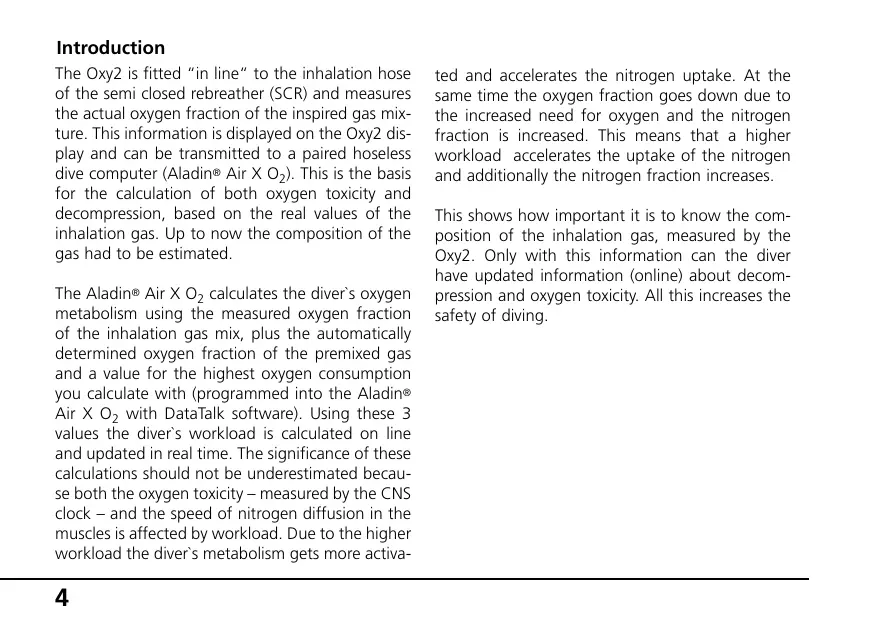 Introduction The Oxy2 is fitted "in line” to the inhalation hose of the semi closed rebreather (SCR) and measures the actual oxygen fraction of the inspired gas mix- ture. This information is displayed on the Oxy2 dis- play and can be transmitted to a paired hoseless dive computer (Aladin® Air X O3). This is the basis for the calculation of both oxygen toxicity and decompression, based on the real values of the inhalation gas. Up to now the composition of the gas had to be estimated The Aladine Air X O, calculates the divers oxygen metabolism using the measured oxygen fraction of the inhalation gas mix, plus the automatically determined oxygen fraction of the premixed gas and a value for the highest oxygen consumption you calculate with (programmed into the Aladin® Air X O} with DataTalk software). Using these 3 values the divers workload is calculated on line and updated in real time. The significance of these calculations should not be underestimated becau- se both the oxygen toxicity — measured by the CNS clock — and the speed of nitrogen diffusion in the muscles is affected by workload. Due to the higher workload the divers metabolism gets more activa- ted and accelerates the nitrogen uptake. At the same time the oxygen fraction goes down due to the increased need for oxygen and the nitrogen fraction is increased. This means that a higher workload_accelerates the uptake of the nitrogen and additionally the nitrogen fraction increases. This shows how important it is to know the com- position of the inhalation gas, measured by the Oxy2. Only with this information can the diver have updated information (online) about decom- pression and oxygen toxicity. AIl this increases the safety of diving