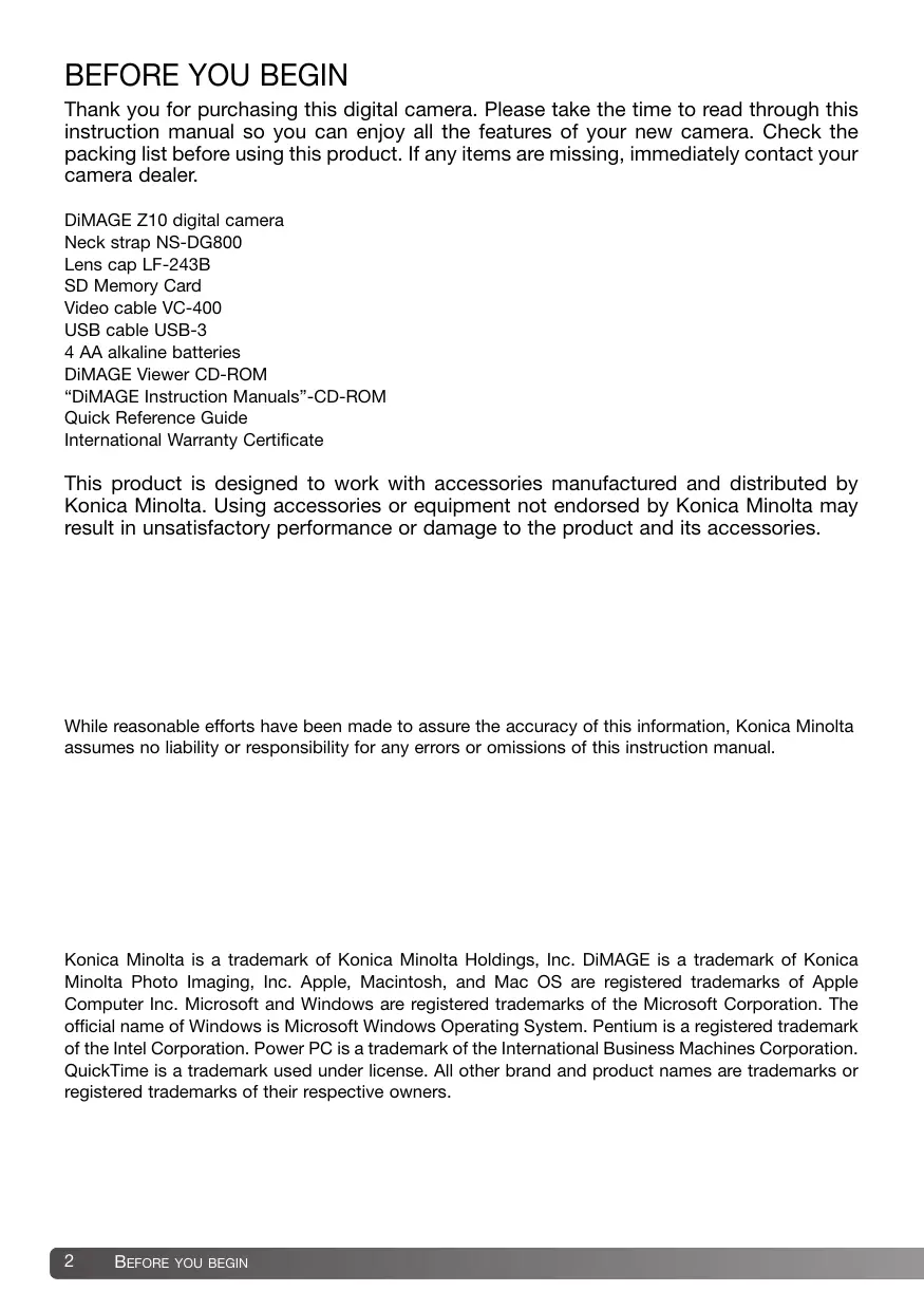 Thank you for purchasing this digital camera. Please take the time to read through this instruction manual so you can enjoy all the features of your new camera. Check the packing list before using this product. If any items are missing, immediately contact your camera dealer. DiMAGE Z10 digital camera Neck strap NS-DG800 Lens cap LF-243B SD Memory Card Video cable VC-400 USB cable USB-3 4 AA alkaline batteries DiMAGE Viewer CD-ROM “DIMAGE Instruction Manuals”-CD-ROM Quick Reference Guide International Warranty Certificate This product is designed to work with accessories manufactured and distributed by Konica Minolta. Using accessories or equipment not endorsed by Konica Minolta may result in unsatisfactory performance or damage to the product and its accessories. While reasonable efforts have been made to assure the accuracy of this information, Konica Minolta assumes no liability or responsibility for any errors or omissions of this instruction manual. Konica Minolta is a trademark of Konica Minolta Holdings, Inc. DiMAGE is a trademark of Konica Minolta Photo Imaging, Inc. Apple, Macintosh, and Mac OS are registered trademarks of Apple Computer Inc. Microsoft and Windows are registered trademarks of the Microsoft Corporation. The official name of Windows is Microsoft Windows Operating System. Pentium is a registered trademark of the Intel Corporation. Power PC is a trademark of the International Business Machines Corporation. QuickTime is a trademark used under license. AI other brand and product names are trademarks or registered trademarks of their respective owners.