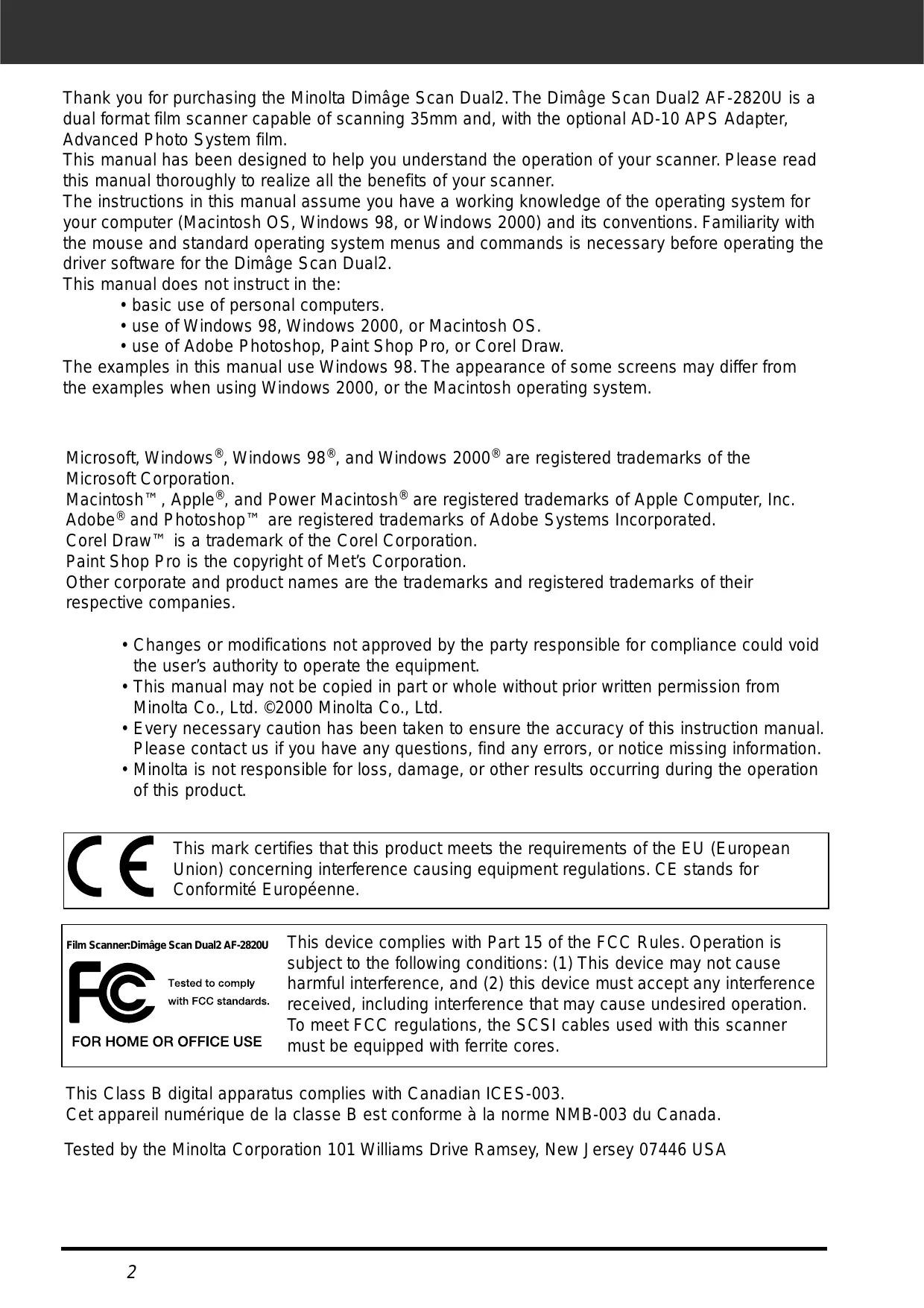 Thank you for purchasing the Minolta Dimâge Scan Dual2. The Dimâge Scan Dual2 AF-282OU is a dual format film scanner capable of scanning 35mm and, with the optional AD-10 APS Adapter, Advanced Photo System film. This manual has been designed to help you understand the operation of your scanner. Please read this manual thoroughly to realize all the benefits of your scanner. The instructions in this manual assume you have à working knowledge of the operating system for your computer (Macintosh OS, Windows 98, or Windows 2000) and its conventions. Familiarity with the mouse and standard operating system menus and commands is necessary before operating the driver software for the Dimâge Scan Dual2. This manual does not instruct in the: