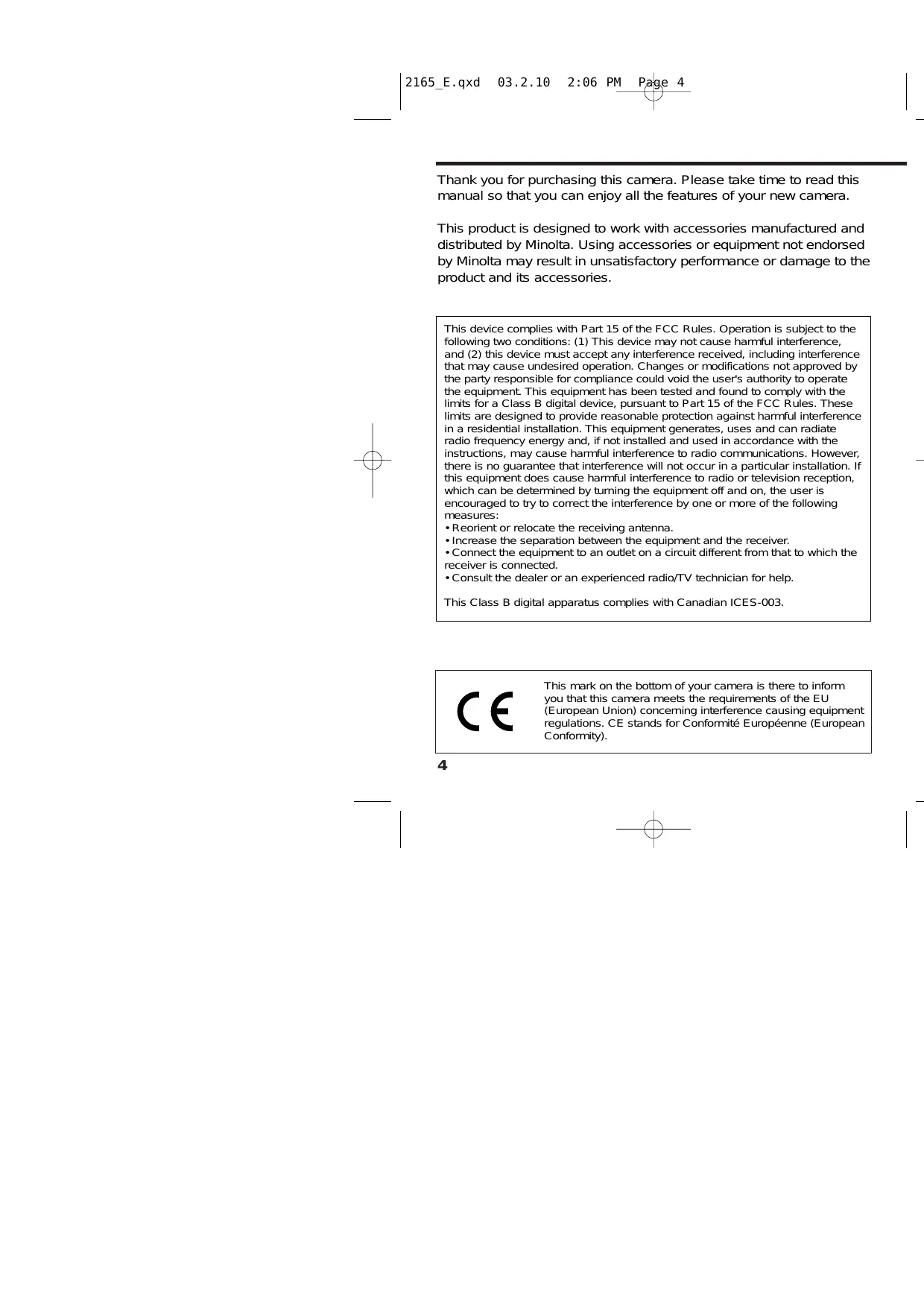 This product is designed to work with accessories manufactured and distributed by Minolta. Using accessories or equipment not endorsed by Minolta may result in unsatisfactory performance or damage to the product and its accessories.