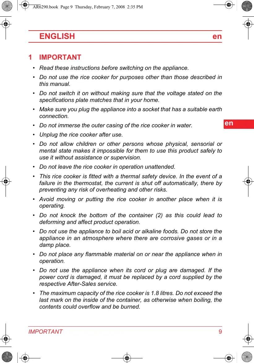 8 Unplug the connection cord when the rice no longer needs to be kept warm, and in all cases before removing the container (2).