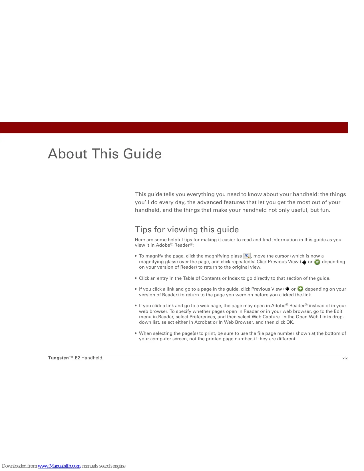 - Index Tungsten™ E2 Handheld Downloaded from www.Manualslib.com manuals search engine xviii About This Guide This guide tells you everything you need to know about your handheld: the things you’ll do every day, the advanced features that let you get the most out of your handheld, and the things that make your handheld not only useful, but fun. Tips for viewing this guide Here are some helpful tips for making it easier to read and find information in this guide as you view it in Adobe® Reader®: p. 602