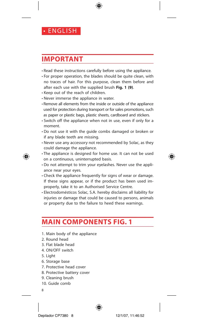 - Clean the appliance after each use using the cleaning brush. Fig. 1 (9) to remove all the hair.