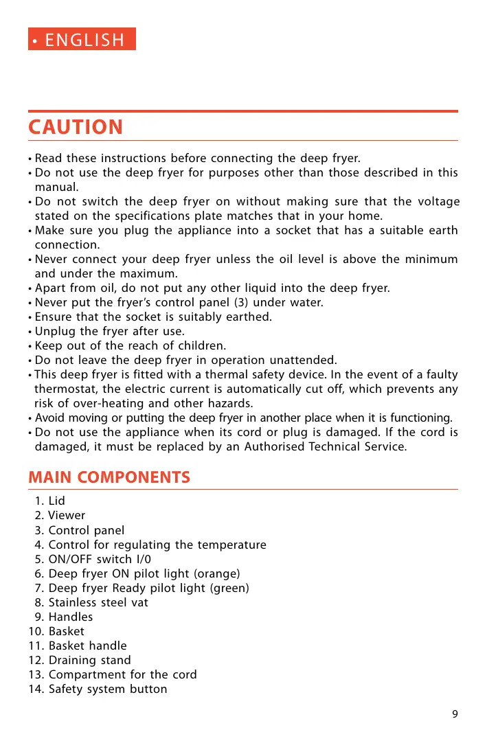 ENGLISH CAUTION + Read these instructions before connecting the deep fryer. + Do not use the deep fryer for purposes other than those described in this manual. + Do not switch the deep fryer on without making sure that the voltage stated on the specifications plate matches that in your home. + Make sure you plug the appliance into a socket that has a suitable earth connection. + Never connect your deep fryer unless the oil level is above the minimum and under the maximum. + Apart from oil, do not put any other liquid into the deep fryer. - Never put the fryer's control panel (3) under water. + Ensure that the socket is suitably earthed. + Unplug the fryer after use. + Keep out of the reach of children. + Do not leave the deep fryer in operation unattended. + This deep fryer is fitted with a thermal safety device. In the event of a faulty thermostat, the electric current is automatically cut off, which prevents any risk of over-heating and other hazards. + Avoid moving or putting the deep fryer in another place when it is functioning. + Do not use the appliance when its cord or plug is damaged. If the cord is damaged, it must be replaced by an Authorised Technical Service. MAIN COMPONENTS