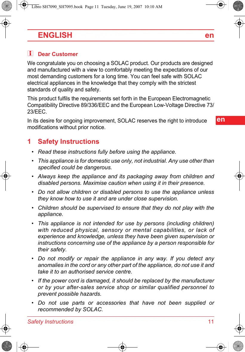 Dear Customer We congratulate you on choosing a SOLAC product. Our products are designed and manufactured with a view to comfortably meeting the expectations of our most demanding customers for a long time. You can feel safe with SOLAC electrical appliances in the knowledge that they comply with the strictest standards of quality and safety. This product fulfils the requirements set forth in the European Electromagnetic Compatibility Directive 89/336/EEC and the European Low-Voltage Directive 73/ 23/EEC.