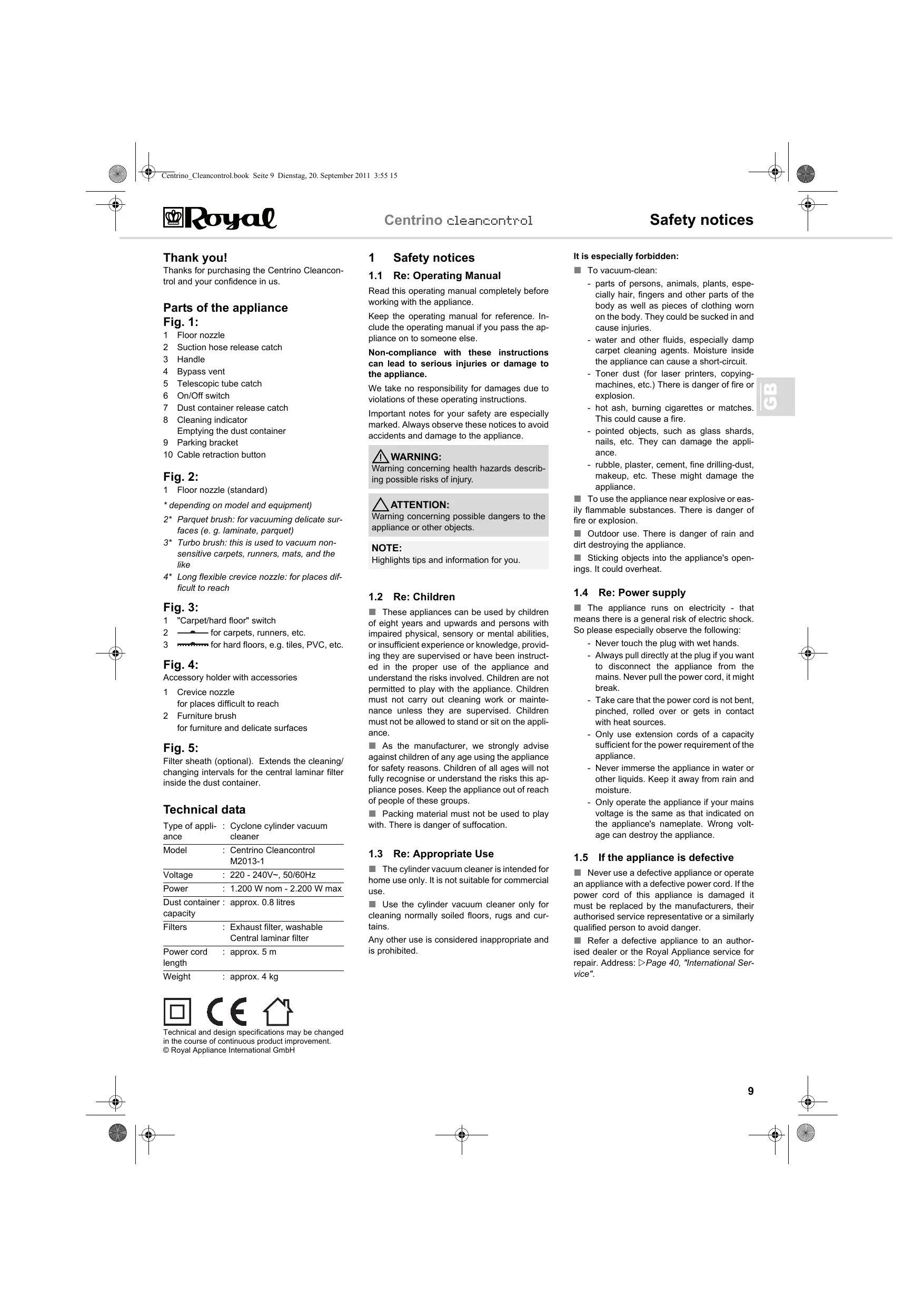 Within this period we will either repair or replace the appliance or accessory (damages to accessories do not automatically cause a replacement of the complete appliance) all defects due to manufacturing or materials at no cost. Damages due to inappropriate use (operation on wrong voltage or type of current, connecting to unsuitable power supplies, breakage, etc.) are exempt from warranty, as are normal wear and minor defects that only negligibly influence the appliance's serviceability. Intrusions by unauthorised parties and the use of spare parts not supplied by Royal Appliance invalidate the warranty. Consumable parts are not included in the warranty and must be paid for! The warranty is only valid if the date of purchase has been acknowledged by the dealer's stamp and signature on the warranty card or if a copy of the invoice or sales slip is included with the sent-in appliance. Warranty work does not extend the warranty period nor does it constitute a claim for a new warranty!