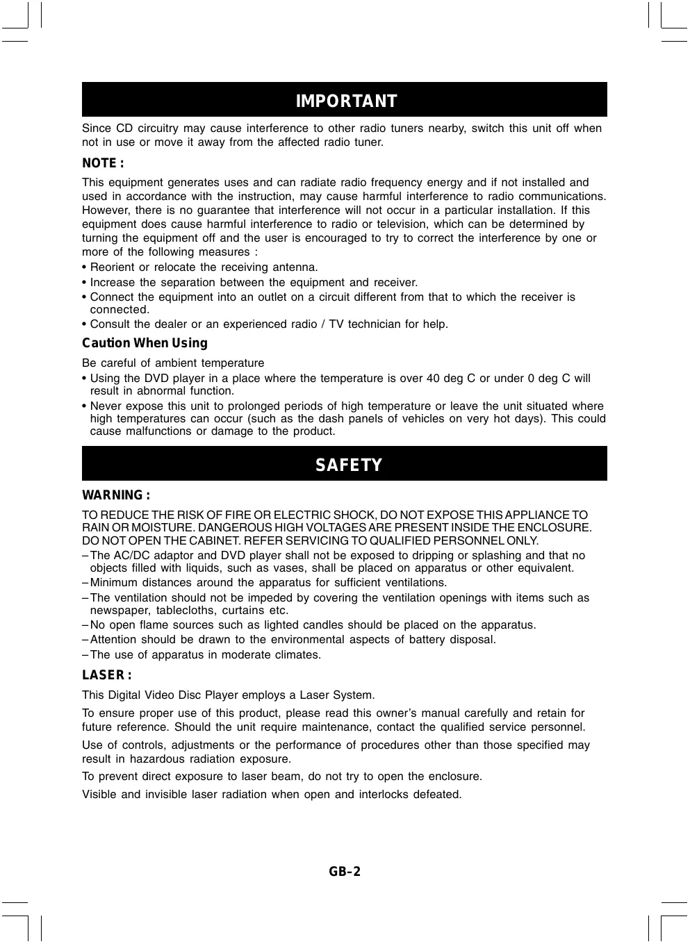 - The AC/DC adaptor and DVD player shall not be exposed to dripping or splashing and that no objects filled with liquids, such as vases, shall be placed on apparatus or other equivalent.