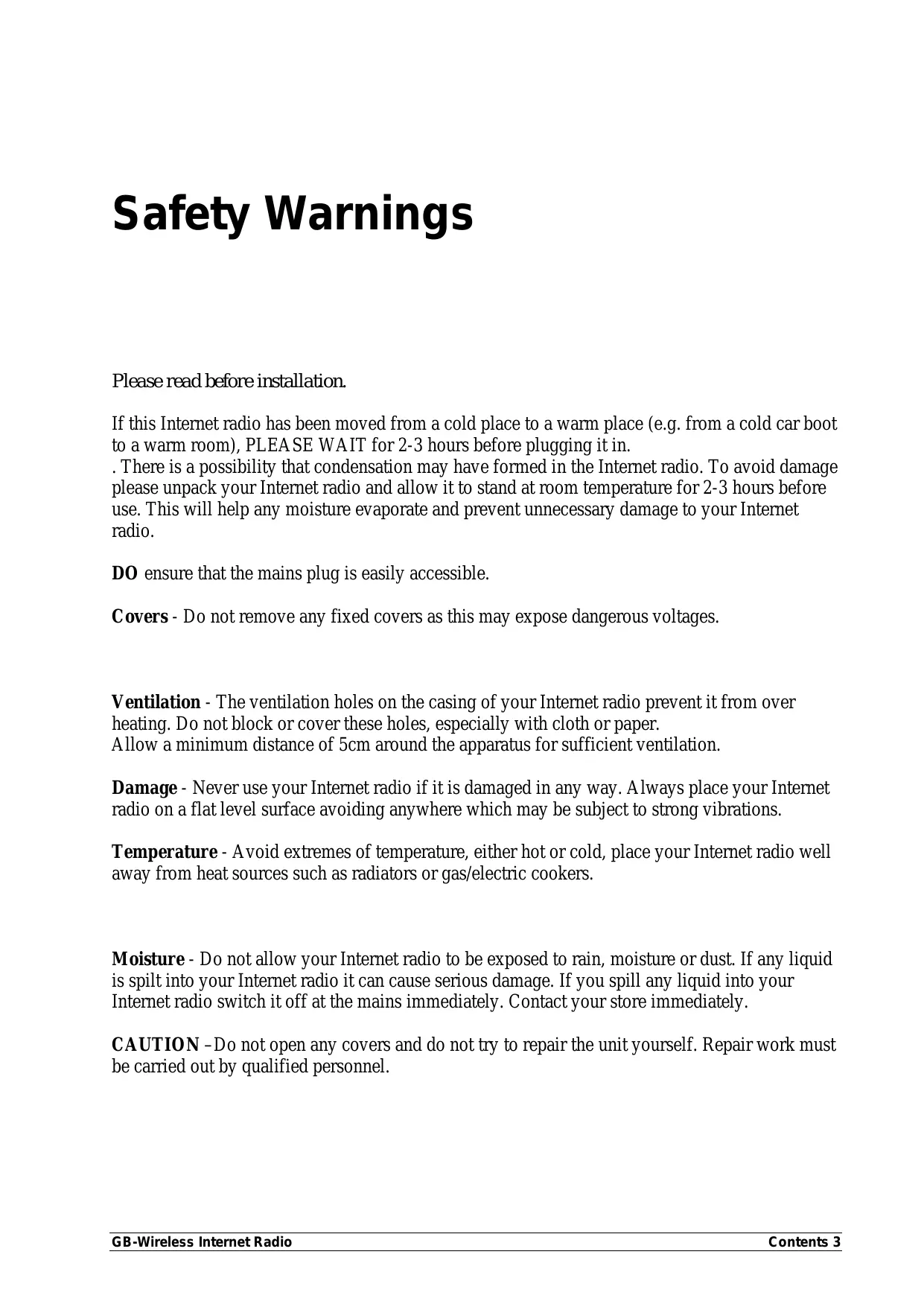 . There is a possibility that condensation may have formed in the Internet radio. To avoid damage please unpack your Internet radio and allow it to stand at room temperature for 2-3 hours before use. This will help any moisture evaporate and prevent unnecessary damage to your Internet radio.