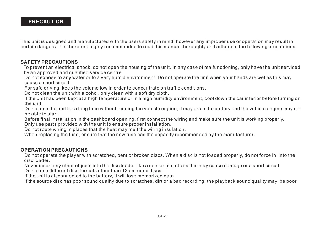 PRECAUTION This unitis designed and manufactured with the users safety in mind, however any improper use or operation may result in certain dangers. Itis therefore highly recommended to read this manual thoroughly and adhere to the following precautions SAFETY PRECAUTIONS To prevent an electrical shock, do not open the housing of the unit. In any case of malfunctioning, only have the unit serviced by an approved and qualified service centre. Do not expose to any water or to a very humid environment. Do not operate the unit when your hands are wet as this may cause a short circuit. For safe driving, keep the volume low in order to concentrate on traffic conditions. Do not clean the unit with alcohol, only clean with a soft dry cloth Ifthe unit has been kept at a high temperature or in a high humidity environment, cool down the car interior before turning on the unit Do not use the unit for a long time without running the vehicle engine, it may drain the battery and the vehicle engine may not be able to start Before final installation in the dashboard opening, first connect the wiring and make sure the unit is working properly. Only use parts provided with the unit to ensure proper installation. Do not route wiring in places that the heat may meltthe wiring insulation When replacing the fuse, ensure that the new fuse has the capacity recommended by the manufacturer. OPERATION PRECAUTIONS Do not operate the player with scratched, bent or broken discs. When a disc is not loaded properly, do not force in into the disc loader. Never insert any other objects into the disc loader like a coin or pin, etc as this may cause damage or a short circuit. Do notuse different disc formats other than 12cm round discs Ifthe unit is disconnected to the battery, it will lose memorized data. Ifthe source disc has poor sound quality due to scratches, dirt or a bad recording, the playback sound quality may be poor. GB-3