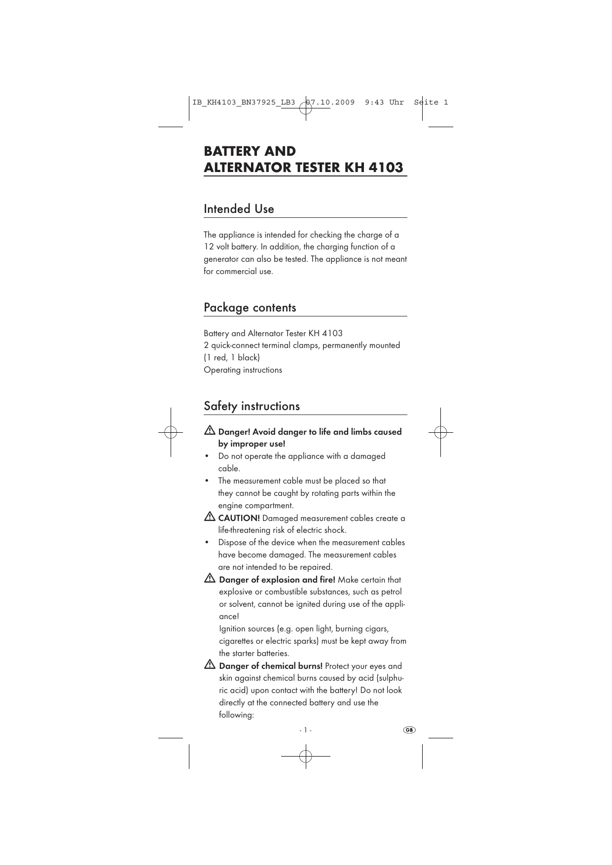 Intended Use The appliance is intended for checking the charge of a 12 volt battery. In addition, the charging function of a generator can also be tested. The appliance is not meant for commercial use. Package contents Battery and Alternator Tester KH 4103 2 quick-connect terminal clamps, permanentlÿ mounted {1 red, 1 black} Operating instructions Safety instructions À Danger! Avoid danger to life and limbs caused by improper usel + Do not operate the appliance with a damaged cable +__ The measurement cable must be placed so that they cannot be caught by rotating parts within the engine compartment. À CAUTIONI Damaged measurement cables create a lifethreatening risk of electric shock. + Dispose ofthe device when the measurement cables have become damaged. The measurement cables are not intended to be repaired À Danger of explosion and firel Make certain that explosive or combustible substances, such as petrol or solvent, cannot be ignited during use of the appli- ancel Ignition sources (e.g. open light, burning cigars, cigarettes or electric sparks] must be kept away from the starter batteries. À Danger of chemical burns! Protect your eyes and skin against chemical burns caused by acid (sulphu- ric acid) upon contact with the battery! Do not look directly at the connected battery and use the following: sdite 1