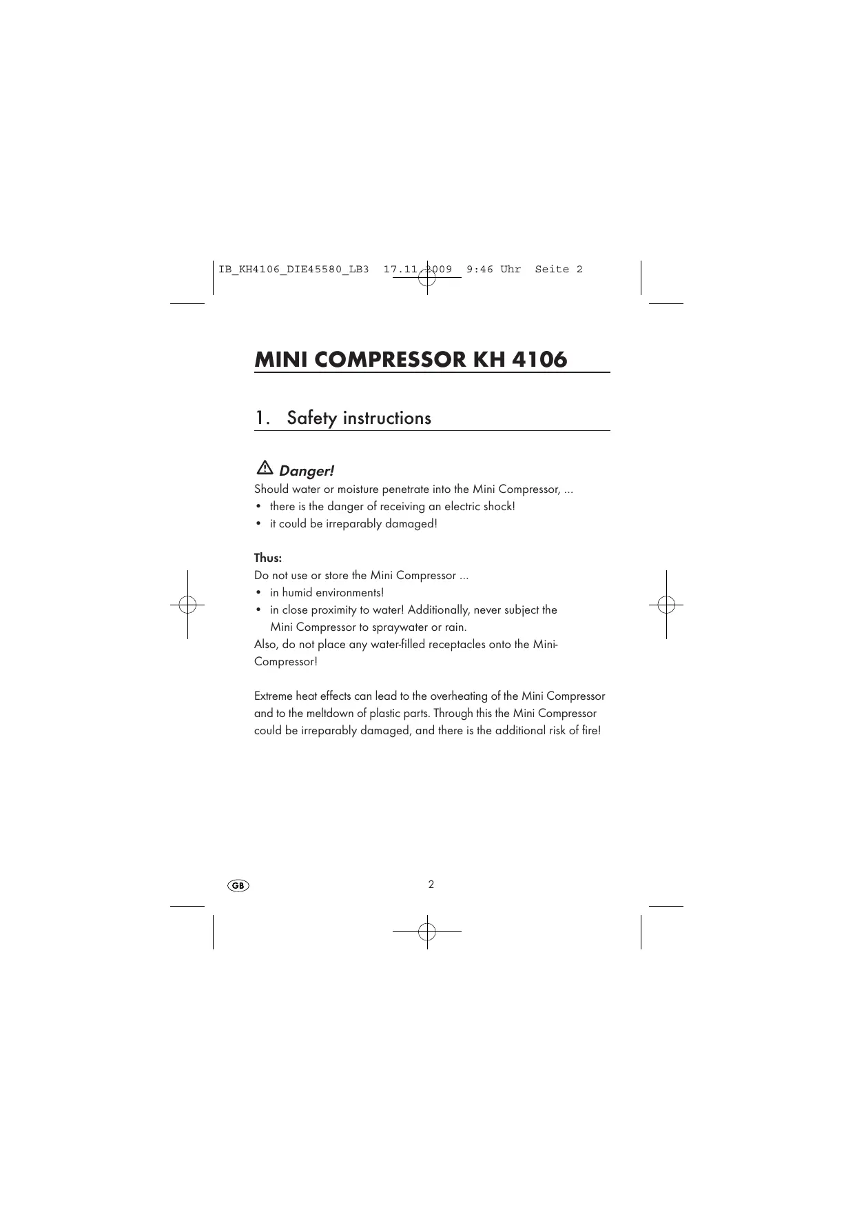 IB_KH4106 DIE45580 LB3 17 sp 9:46 Uhr Seite 3 Thus: + Do not place the Mini Compressor in close proximity to heat sources. Do not place unprotected open flame sources - e.g. burning candles - on the Mini Compressorl Do not leave the Mini Compressor in a vehicle if there are high outdoor temperatures. Especially in summer the temperature inside a vehicle can become extremely high. Do not cover the ventilation openings of the Mini Compressorl Therefore, do not place the Mini Compressor on blankets or other textiles etc. Take note that the Mini Compressor is not suitable for constant operation. Thus do permit the Mini Compressor to be switched on without a break for periods in excess of 10 minutes. Allow itto cool down for at least 30 minutes before switching it back on. The Mini Compressor should not be used or stored in dusty environ- ments. Dust could penetrate into the Mini Compressor. Should large amounis of dust penelrate into the Mini Compressor it could overheat and be irreparably damaged. There is also a danger of firel Never attempt to repair the power cable yourself in the case of a defectl There is the danger of an electric shock! Instead, approach one of our service partners.