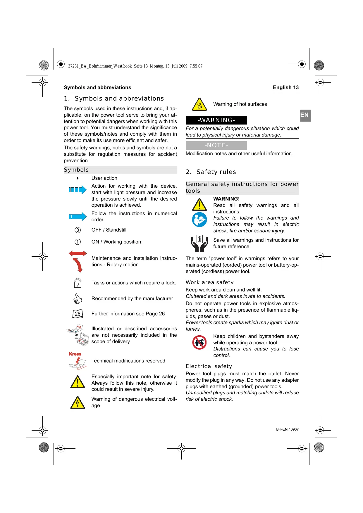 General safety instructions for power tools WARNING! Read all safety warnings and all instructions. Failure to follow the warnings and instructions may result in electric shock, fire and/or serious injury. Save all warnings and instructions for future reference. Maintenance and installation instructions - Rotary motion The term "power tool" in warnings refers to your mains-operated (corded) power tool or battery-operated (cordless) power tool. Tasks or actions which require a lock. Work area safety Keep work area clean and well lit. Cluttered and dark areas invite to accidents. Do not operate power tools in explosive atmospheres, such as in the presence of flammable liquids, gases or dust. Power tools create sparks which may ignite dust or fumes. Keep children and bystanders away while operating a power tool. Distractions can cause you to lose control. Recommended by the manufacturer Further information see Page 26 Illustrated or described accessories are not necessarily included in the scope of delivery Technical modifications reserved Especially important note for safety. Always follow this note, otherwise it could result in severe injury. Warning of dangerous electrical voltage Electrical safety Power tool plugs must match the outlet. Never modify the plug in any way. Do not use any adapter plugs with earthed (grounded) power tools. Unmodified plugs and matching outlets will reduce risk of electric shock. BH-EN / 0907 14 English Avoid body contact with grounded surfaces such as pipes, radiators, ranges and refrigerators. There is an increased risk of electric shock if your EN body is grounded. Do not expose power tools to rain or wet conditions. Water entering a power tool will increase the risk of electric shock. Do not abuse the cord. Never use the cord for carrying, pulling or unplugging the power tool. Keep cord away from heat, oil, sharp edges or moving parts. Damaged or entangled cords increase the risk of electric shock. When operating a power tool outdoors, use an extension cord suitable for outdoor use. Use of a cord suitable for outdoor use reduces the risk of electric shock. If operating a power tool in a damp location is unavoidable, use a residual current device (RCD) protected supply. Use of an RCD reduces the risk of electric shock. Personal safety Stay alert, watch what you are doing and use common sense when operating a power tool. Do not use a power tool while you are tired or under the influence of drugs, alcohol or medication. A moment of inattention while operating power tools may result in serious personal injury. Use safety equipment. Always wear eye protection. Safety equipment such as dust mask, non-skid safety shoes, hard hat, or hearing protection used for appropriate conditions will reduce personal injuries. Prevent unintentional starting. Ensure the switch is in the off-position before connecting to power source and/or battery pack, picking up or carrying the tool. Carrying power tools with your finger on the switch or energising power tools that have the switch on invites accidents. Remove any adjusting key or wrench before turning the power tool on. A wrench or a key left attached to a rotating part of the power tool may result in personal injury. BH-EN / 0907 Safety rules Do not overreach. Keep proper footing and balance at all times. This enables better control of the power tool in unexpected situations. Dress properly. Do not wear loose clothing or jewellery. Keep your hair, clothing and gloves away from moving parts. Loose clothes, jewellery or long hair can be caught in moving parts. If devices are provided for connecting dust extraction and collection facilities, ensure these are connected and properly used. Use of these devices can reduce dust related hazards. Power tool use and care Do not force the power tool. Use the correct power tool for your application. The correct power tool will do the job better and safer at the rate for which it was designed. Do not use the power tool if the switch does not turn on and off. Any power tool that cannot be controlled with the switch is dangerous and must be repaired. Disconnect the plug from the power source and/or the battery pack from the power tool before making any adjustments, changing accessories, or storing power tools. Such preventive safety measures reduce the risk of starting the power tool accidentally. Store idle power tools out of the reach of children and do not allow persons unfamiliar with the power tool or these instructions to operate the power tool. Power tools are dangerous in the hands of untrained users. Maintain power tools. Check for misalignment or binding of moving parts, breakage of parts and any other condition that may affect the power tools operation. If damaged, have the power tool repaired before use. Many accidents are caused by poorly maintained power tools. Keep cutting tools sharp and clean. Properly maintained cutting tools with sharp cutting edges are less likely to bind and are easier to control. Use the power tool, accessories and tool bits etc. in accordance with these instructions and in the Safety rules manner intended for the particular type of power tool, taking into account the working conditions and the work to be performed. Use of the power tool for operations different from those intended could result in a hazardous situation. Service Have your power tool serviced by a qualified repair person using only original spare parts. This will ensure that the safety of the power tool is maintained. Machine-specific Safety Warnings Wear hearing protection. The effects of noise can cause loss of hearing capacity. Use auxiliary handles supplied with the tool. Loss of control can cause personal injury. Always assume a safe standing position and hold the power tool securely in both hands. When the drill unexpectedly jams, the machine kicks back. Hold the power tool only by the insulated gripping surfaces when performing an operation where the cutting tool may contact hidd