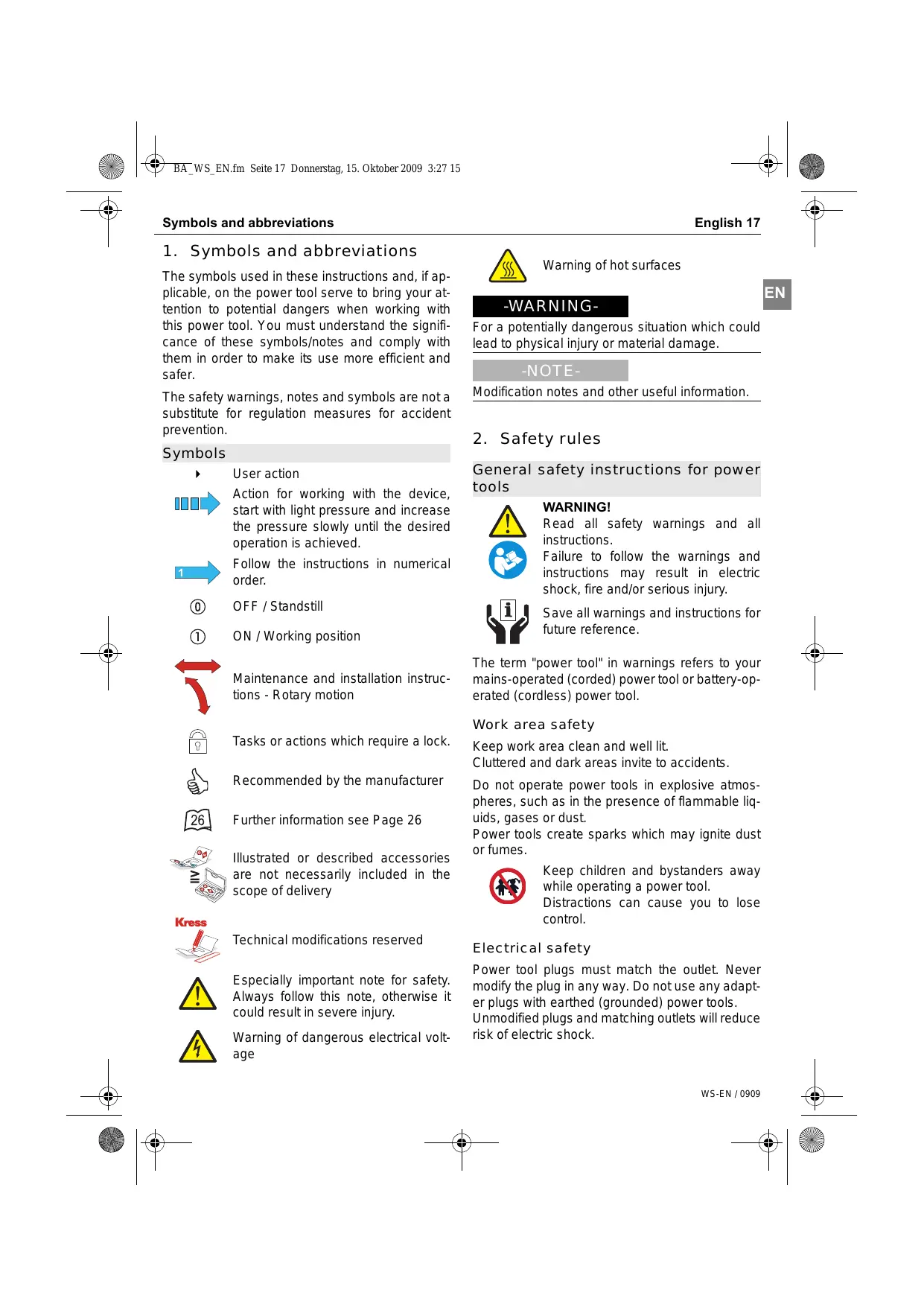 General safety instructions for power tools WARNING! Read all safety warnings and all instructions. Failure to follow the warnings and instructions may result in electric shock, fire and/or serious injury. Save all warnings and instructions for future reference. The term "power tool" in warnings refers to your mains-operated (corded) power tool or battery-operated (cordless) power tool. Work area safety Tasks or actions which require a lock. Keep work area clean and well lit. Cluttered and dark areas invite to accidents. Recommended by the manufacturer Do not operate power tools in explosive atmospheres, such as in the presence of flammable liquids, gases or dust. Power tools create sparks which may ignite dust or fumes. Further information see Page 26 Illustrated or described accessories are not necessarily included in the scope of delivery Keep children and bystanders away while operating a power tool. Distractions can cause you to lose control. Technical modifications reserved Electrical safety Especially important note for safety. Always follow this note, otherwise it could result in severe injury. Power tool plugs must match the outlet. Never modify the plug in any way. Do not use any adapter plugs with earthed (grounded) power tools. Unmodified plugs and matching outlets will reduce risk of electric shock. Warning of dangerous electrical voltage WS-EN / 0909 Avoid body contact with grounded surfaces such as pipes, radiators, ranges and refrigerators. There is an increased risk of electric shock if your EN body is grounded. Remove any adjusting key or wrench before turning the power tool on. A wrench or a key left attached to a rotating part of the power tool may result in personal injury. Do not expose power tools to rain or wet conditions. Water entering a power tool will increase the risk of electric shock. Do not overreach. Keep proper footing and balance at all times. This enables better control of the power tool in unexpected situations. Do not abuse the cord. Never use the cord for carrying, pulling or unplugging the power tool. Keep cord away from heat, oil, sharp edges or moving parts. Damaged or entangled cords increase the risk of electric shock. Dress properly. Do not wear loose clothing or jewellery. Keep your hair, clothing and gloves away from moving parts. Loose clothes, jewellery or long hair can be caught in moving parts. When operating a power tool outdoors, use an extension cord suitable for outdoor use. Use of a cord suitable for outdoor use reduces the risk of electric shock. If operating a power tool in a damp location is unavoidable, use a residual current device (RCD) protected supply. Use of an RCD reduces the risk of electric shock. Personal safety Stay alert, watch what you are doing and use common sense when operating a power tool. Do not use a power tool while you are tired or under the influence of drugs, alcohol or medication. A moment of inattention while operating power tools may result in serious personal injury. Use safety equipment. Always wear eye protection. Safety equipment such as dust mask, non-skid safety shoes, hard hat, or hearing protection used for appropriate conditions will reduce personal injuries. Prevent unintentional starting. Ensure the switch is in the off-position before connecting to power source and/or battery pack, picking up or carrying the tool. Carrying power tools with your finger on the switch or energising power tools that have the switch on invites accidents. WS-EN / 0909 If devices are provided for connecting dust extraction and collection facilities, ensure these are connected and properly used. Use of these devices can reduce dust related hazards. Power tool use and care Do not force the power tool. Use the correct power tool for your application. The correct power tool will do the job better and safer at the rate for which it was designed. Do not use the power tool if the switch does not turn on and off. Any power tool that cannot be controlled with the switch is dangerous and must be repaired. Disconnect the plug from the power source and/or the battery pack from the power tool before making any adjustments, changing accessories, or storing power tools. Such preventive safety measures reduce the risk of starting the power tool accidentally. Store idle power tools out of the reach of children and do not allow persons unfamiliar with the power tool or these instructions to operate the power tool. Power tools are dangerous in the hands of untrained users. Maintain power tools. Check for misalignment or binding of moving parts, breakage of parts and any other condition that may affect the power tools operation. If damaged, have the power tool repaired before use. Many accidents are caused by poorly maintained power tools. Safety rules Keep cutting tools sharp and clean. Properly maintained cutting tools with sharp cutting edges are less likely to bind and are easier to control. Use the power tool, accessories and tool bits etc. in accordance with these instructions and in the manner intended for the particular type of power tool, taking into account the working conditions and the work to be performed. Use of the power tool for operations different from those intended could result in a hazardous situation. English 19 The outside diameter and the thickness of your accessory must be within the capacity rating of your power tool. Incorrectly sized accessories cannot be ade- EN quately guarded or controlled. The arbour size of wheels, flanges, backing pads or any other accessory must properly fit the spindle of the power tool. Accessories with arbour holes that do not match the mounting hardware of the power tool will run out of balance, vibrate excessively and may cause loss of control. Service Have your power tool serviced by a qualified repair person using only original spare parts. This will ensure that the safety of the power tool is maintained. Machine-specific Safety Warnings Safety instructions for grinding, sandi
