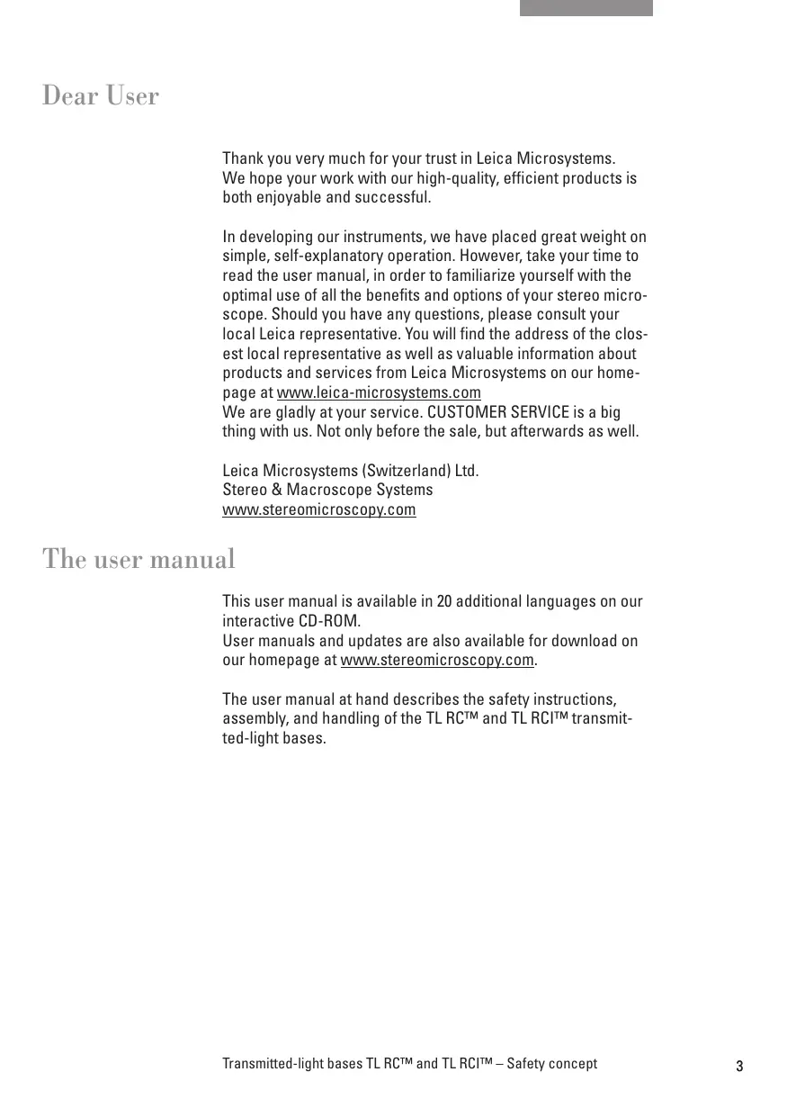 The TL RCTM and TL RCIM transmitted-light bases are a module of the Leica M stereo microscope series. This user manual describes the special functions of the transmitted-light base and con- tains important instructions for operating safety, maintenance and the accessory parts.