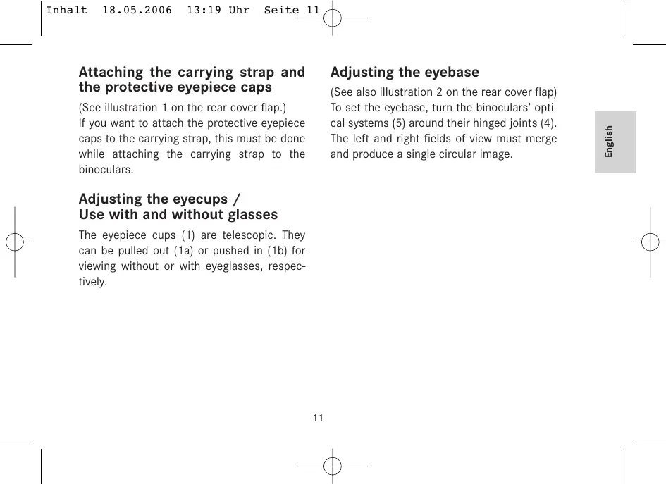 13:19 Uhr Seite 11 Attaching the carrying strap and the protective eyepiece caps Adjusting the eyebase (See also illustration 2 on the rear cover flap) To set the eyebase, turn the binoculars’ optical systems (5) around their hinged joints (4). The left and right fields of view must merge and produce a single circular image. (See illustration 1 on the rear cover flap.) If you want to attach the protective eyepiece caps to the carrying strap, this must be done while attaching the carrying strap to the binoculars. Adjusting the eyecups / Use with and without glasses The eyepiece cups (1) are telescopic. They can be pulled out (1a) or pushed in (1b) for viewing without or with eyeglasses, respectively.