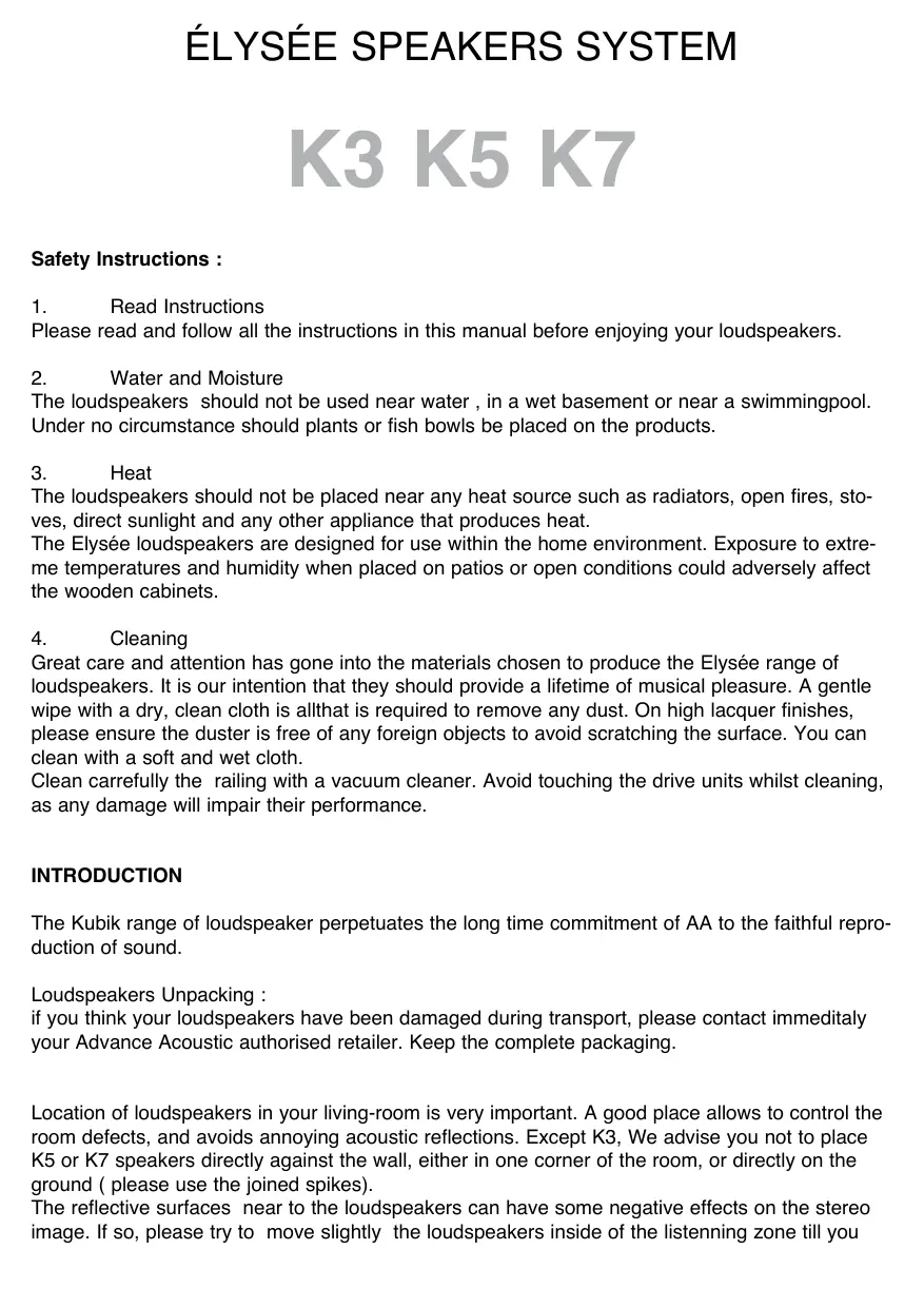 K3 K5 K7 Safety Instructions : Read Instructions Please read and follow all the instructions in this manual before enjoying your loudspeakers. Water and Moisture The loudspeakers should not be used near water , in a wet basement or near a swimmingpool. Under no circumstance should plants or fish bowls be placed on the products. Heat The loudspeakers should not be placed near any heat source such as radiators, open fires, stoves, direct sunlight and any other appliance that produces heat. The Elysée loudspeakers are designed for use within the home environment. Exposure to extreme temperatures and humidity when placed on patios or open conditions could adversely affect the wooden cabinets. Cleaning Great care and attention has gone into the materials chosen to produce the Elysée range of loudspeakers. It is our intention that they should provide a lifetime of musical pleasure. A gentle wipe with a dry, clean cloth is allthat is required to remove any dust. On high lacquer finishes, please ensure the duster is free of any foreign objects to avoid scratching the surface. You can clean with a soft and wet cloth. Clean carrefully the railing with a vacuum cleaner. Avoid touching the drive units whilst cleaning, as any damage will impair their performance. INTRODUCTION The Kubik range of loudspeaker perpetuates the long time commitment of AA to the faithful reproduction of sound. Loudspeakers Unpacking : if you think your loudspeakers have been damaged during transport, please contact immeditaly your Advance Acoustic authorised retailer. Keep the complete packaging. Location of loudspeakers in your living-room is very important. A good place allows to control the room defects, and avoids annoying acoustic reflections. Except K3, We advise you not to place K5 or K7 speakers directly against the wall, either in one corner of the room, or directly on the ground ( please use the joined spikes). The reflective surfaces near to the loudspeakers can have some negative effects on the stereo image. If so, please try to move slightly the loudspeakers inside of the listenning zone till you obtain the better sound. It’s really important to the loudspeakers K5 and K7 to have the bass drivers inside so face to face. In some cases of reverberation room whose walls are far more than a metre of loudspeakers, it’s possible to reverse the loudspeakers position. Test carefully on several CD. K5 and K7 installation