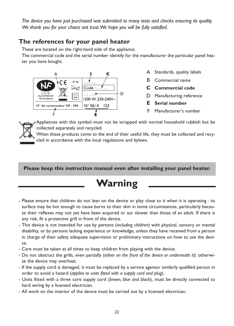 Le Code commercial et le Numéro de série identifient auprès du constructeur le panneau rayonnant que vous venez d’acquérir. A Normes, labels de qualité
