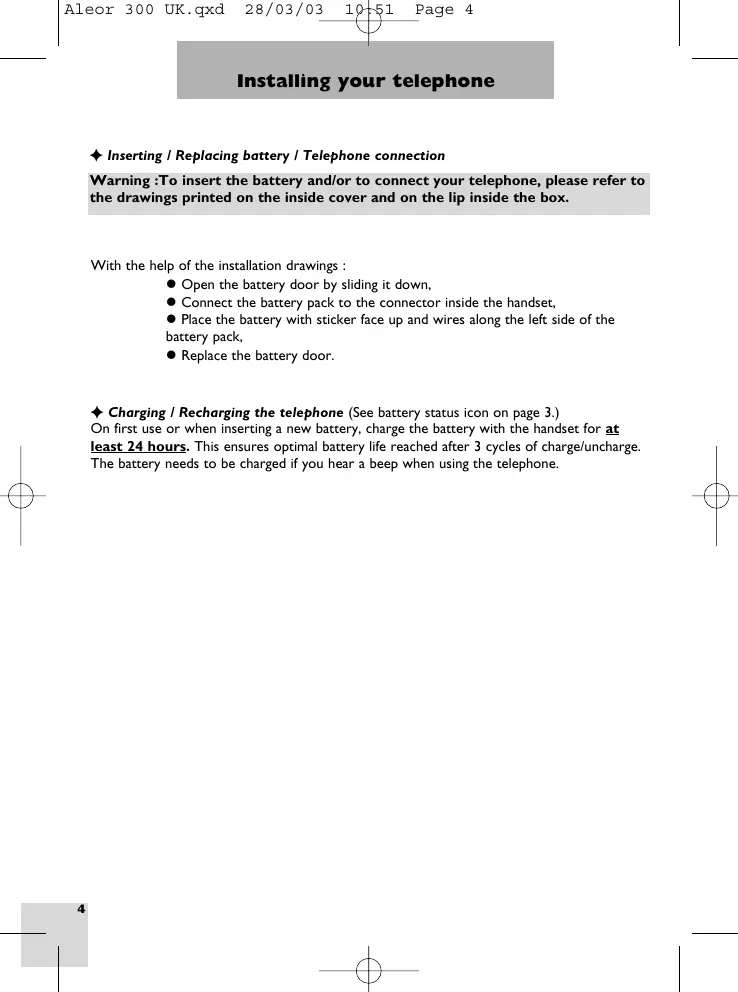F Charging / Recharging the telephone (See battery status icon on page 3.) On first use or when inserting a new battery, charge the battery with the handset for at least 24 hours. This ensures optimal battery life reached after 3 cycles of charge/uncharge. The battery needs to be charged if you hear a beep when using the telephone.