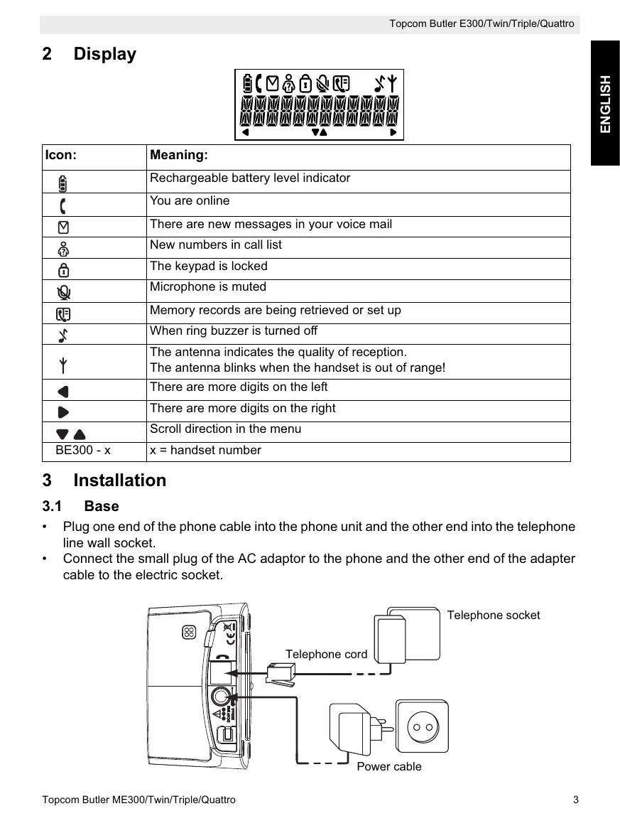 !!! You only need to subscribe the handset if: • The handset subscription has been removed from the base unit (e.g. for reinitialisation) • If you want to subscribe a different handset to this base unit. The below procedure is only applicable to a Topcom Butler E300 handset and base unit!! Keep the Paging key on the base unit pressed for 4 seconds. During one minute the base unit is in register mode and you must do the following to subscribe the handset: Press Menu button ÆUse the button to scroll to ‘System’ and press Æ Select ‘Register’ Æ Enter the base pin code (0000) and press . Enter the number of the base unit you would like to subscribe the handset to (1-4) Æ The unit will start searching for the base and when found it will register Æ If the pin is wrong, the handset will restart the searching for the base Æ When the handset is registered, it will show the handset name and at the right the handset number.