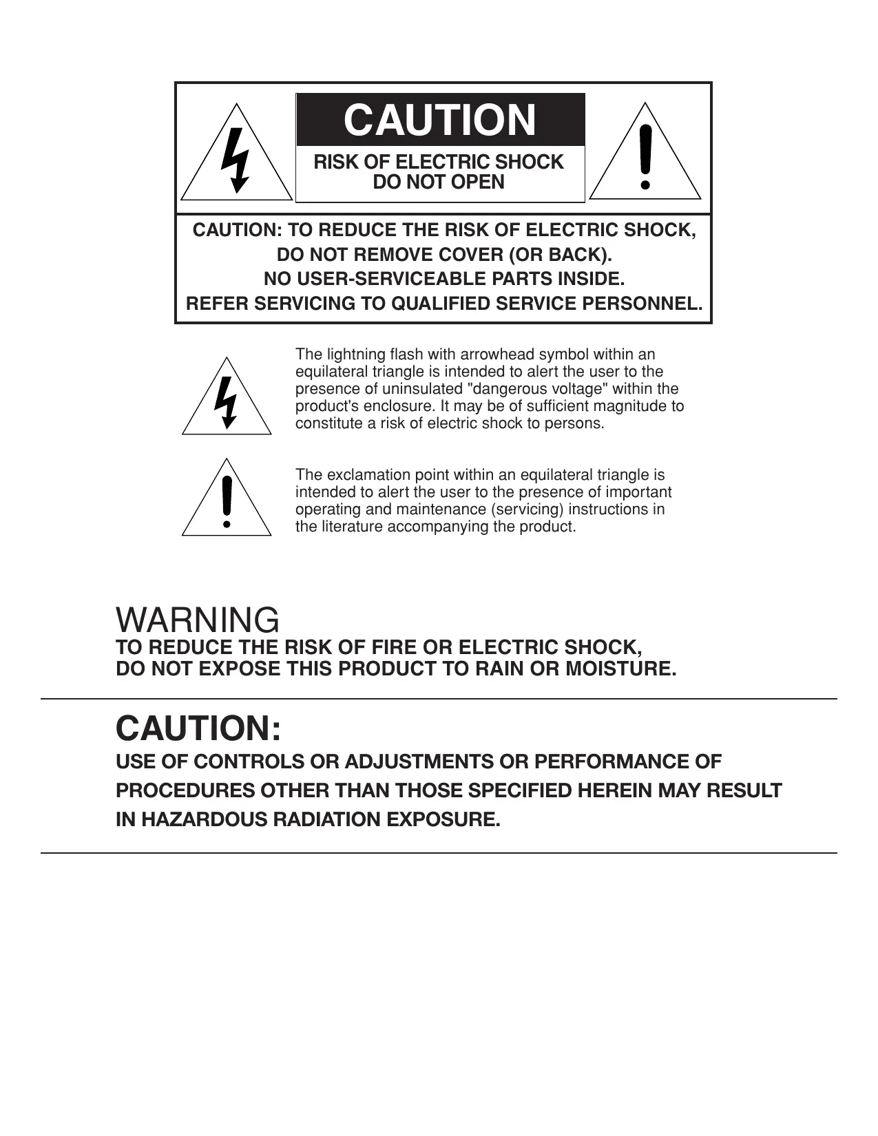 CAUTION: TO REDUCE THE RISK OF ELECTRIC SHOCK, DO NOT REMOVE COVER (OR BACK). NO USER-SERVICEABLE PARTS INSIDE. REFER SERVICING TO QUALIFIED SERVICE PERSONNEL. The lighining flash with arrowhead symbol within an equilateral triangle is intended to alert the user to the presence of uninsulated "dangerous voltage" within the product's enclosure. lt may be of sufficient magnitude to constitute a risk of electric shock to persons. The exclamation point within an equilateral triangle is intended to alert the user to the presence of important operating and maintenance (servicing) instructions in the literature accompanying the product. WARNING TO REDUCE THE RISK OF FIRE OR ELECTRIC SHOCK, DO NOT EXPOSE THIS PRODUCT TO RAIN OR MOISTURE. CAUTION: USE OF CONTROLS OR ADJUSTMENTS OR PERFORMANCE OF PROCEDURES OTHER THAN THOSE SPECIFIED HEREIN MAY RESULT IN HAZARDOUS RADIATION EXPOSURE.
