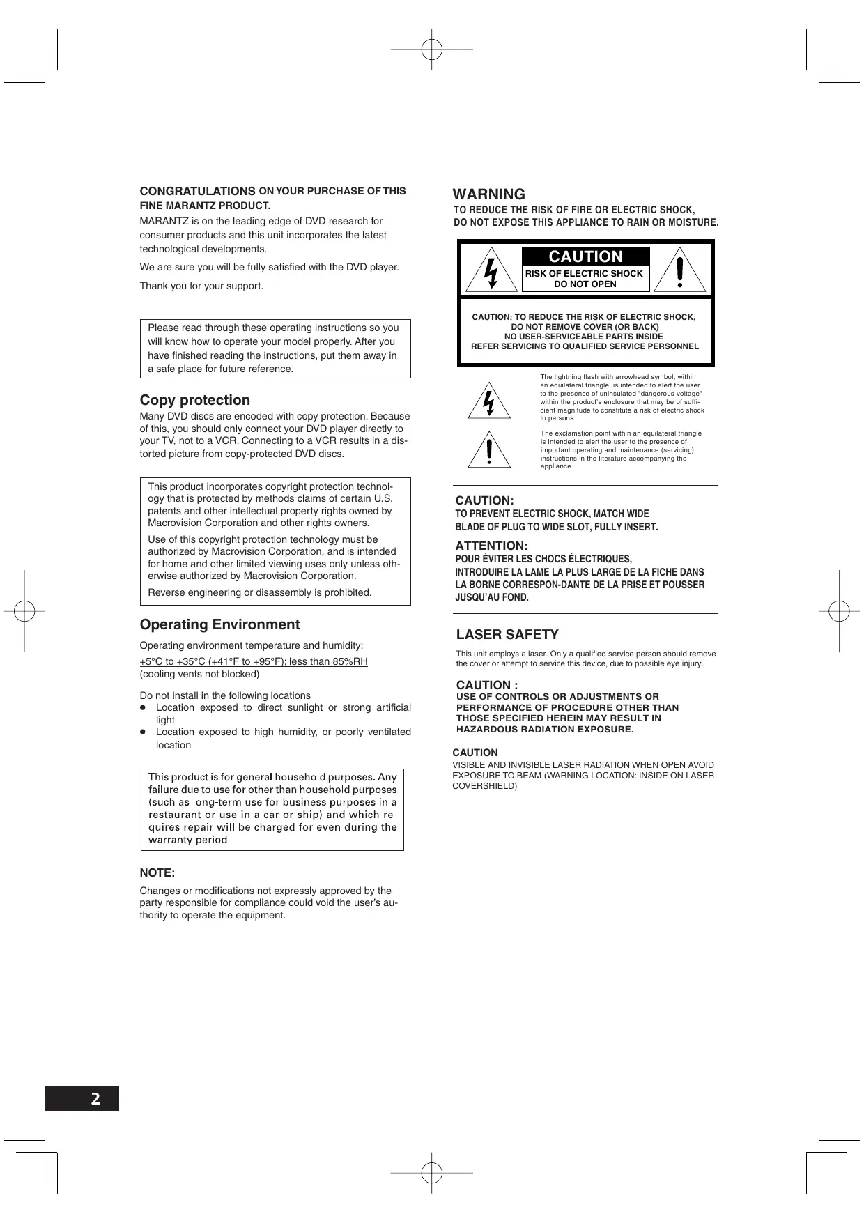 FINE MARANTZ PRODUCT. MARANTZ is on the leading edge of DVD research for consumer products and this unit incorporates the latest technological developments. We are sure you will be fully satisfied with the DVD player. Thank you for your support. Please read through these operating instructions so you will know how to operate your model properiy. After you have finished reading the instructions, put them away in a safe place for future reference. Copy protection Many DVD discs are encoded with copy protection. Because of this, you should only connect your DVD player directly to your TV, not to a VCR. Connecting to a VCR results in a dis- torted picture from copy-protected DVD discs. This product incorporates copyright protection technol- ogy that is protected by methods claims of certain U.S. patents and other intellectual property rights owned by Macrovision Corporation and other rights owners. Use of this copyright protection technology must be authorized by Macrovision Corporation, and is intended for home and other limited viewing uses only unless oth- erwise authorized by Macrovision Corporation. Reverse engineering or disassembly is prohibited. Operating Environment Operating environment temperature and humidity: 45°C to +35°C (+41°F to +95°F); less than 85%RH {cooling vents not blocked) Do not install in the following locations + Location exposed to direct sunlight or strong artificial light «Location exposed to high humidity, or poorly ventilated location This productis for general household purposes. Any failure due to use for other than household purposes {such as long-term use for business purposes in a restaurant or use in a car or ship) and which re- quires repair will be charged for even during the warranty period NOTE: Changes or modifications not expressiy approved by the party responsible for compliance could void the users au- thority to operate the equipment. WARNING TO REDUCE THE RISK OF FIRE OR ELECTRIC SHOCK, DO NOT EXPOSE THIS APPLIANCE TO RAIN OR MOISTURE. k RISK OF ELECTRIC SHOCK