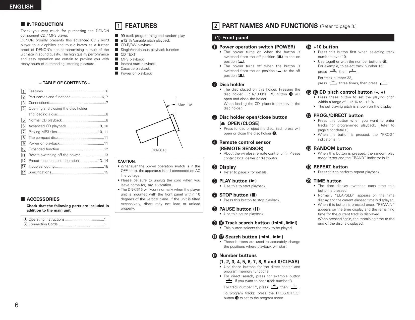 - Symbols ENGLISH 2 INTRODUCTION Thank you very much for purchasing the DENON component CD / MP3 player. DENON proudly presents this advanced CD / MP3 player to audiophiles and music lovers as a further proof of DENON’s non-compromising pursuit of the ultimate in sound quality. The high quality performance and easy operation are certain to provide you with many hours of outstanding listening pleasure. 1 FEATURES